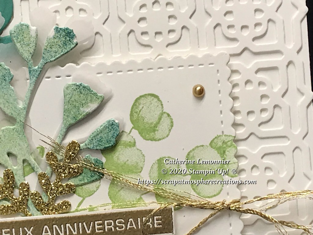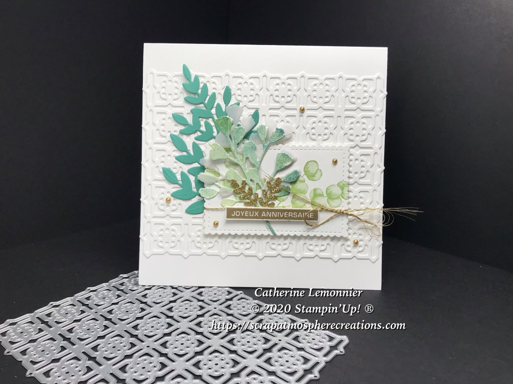 Cette fois j’ai également utilisé le poinçon Méandre de Médaillons en ton sur ton pour créer un effet de fond, ainsi que le lot de poinçons Couture Tendres Douceurs. Côté couleurs, on retrouve le Vert Jade et le Vert Olive…Pour la découpe centrale, c’est un travail d’encrage avec plusieurs couleurs de vert qui donne ce résultat tout en nuances…