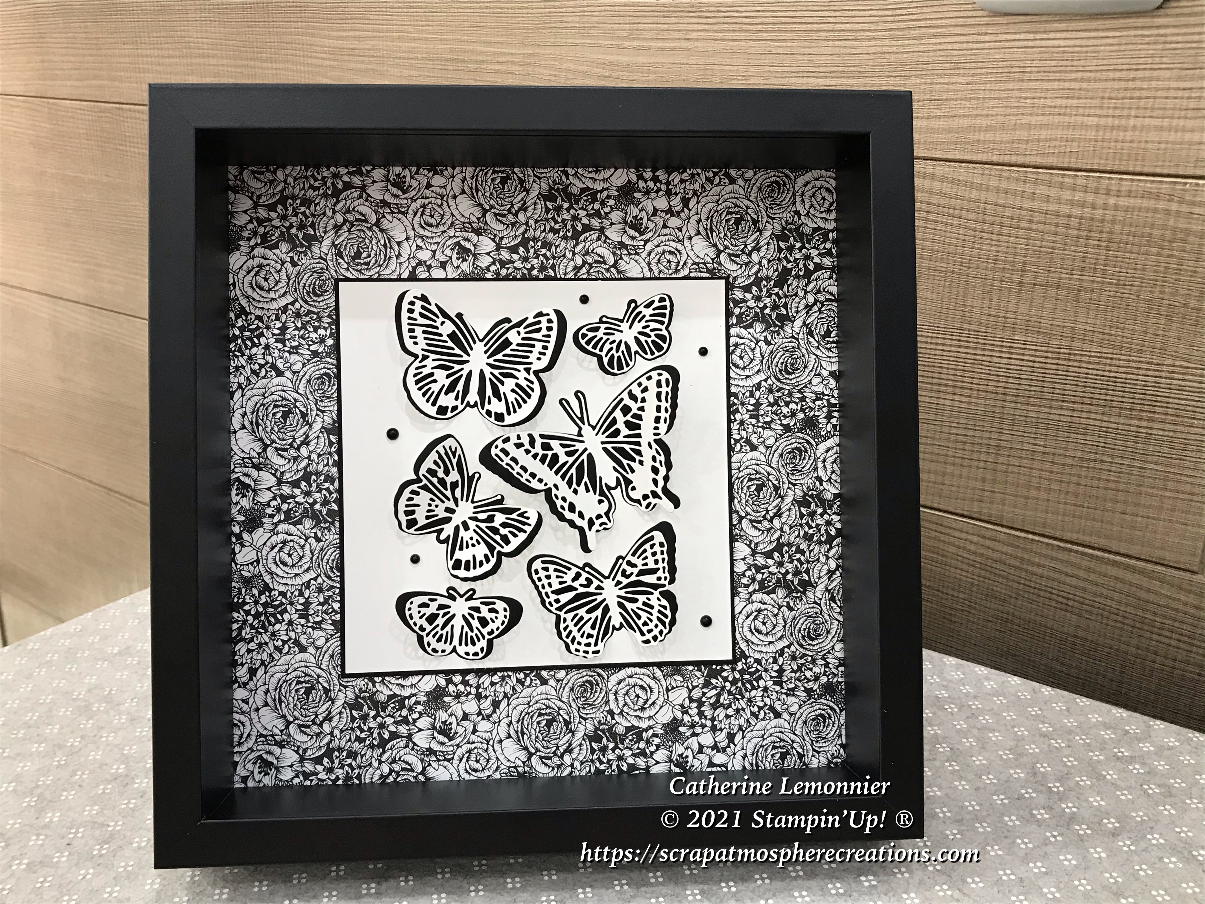Pour le deuxième, j’ai d’abord créé la découpe à l’aide de ce grand poinçon dans le papier Blanc Simple, que j’ai adossé à du papier Noir Nu, puis j’ai découpé les papillons « dentelle » et je les ai collés.