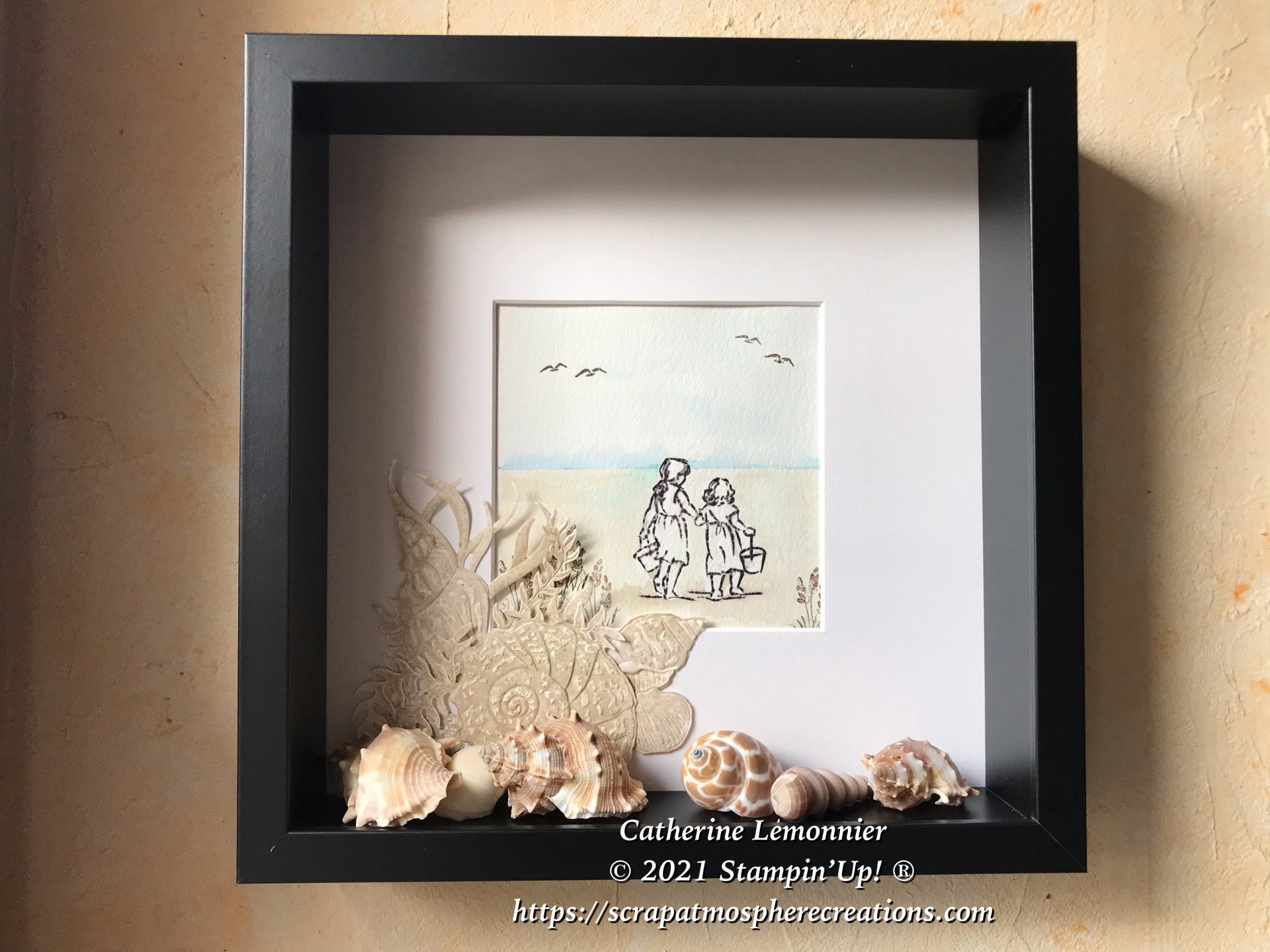 Pour réaliser ce cadre, j’ai d’abord créé ma petite scène de bord de mer sur du papier aquarelle avec l’un des superbes tampons du set Beautiful moments. J’ai fait le fond (sable, mer et ciel) avec des encres liquides…