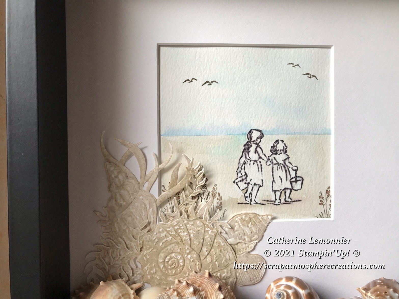 Pour réaliser ce cadre, j’ai d’abord créé ma petite scène de bord de mer sur du papier aquarelle avec l’un des superbes tampons du set Beautiful moments. J’ai fait le fond (sable, mer et ciel) avec des encres liquides…