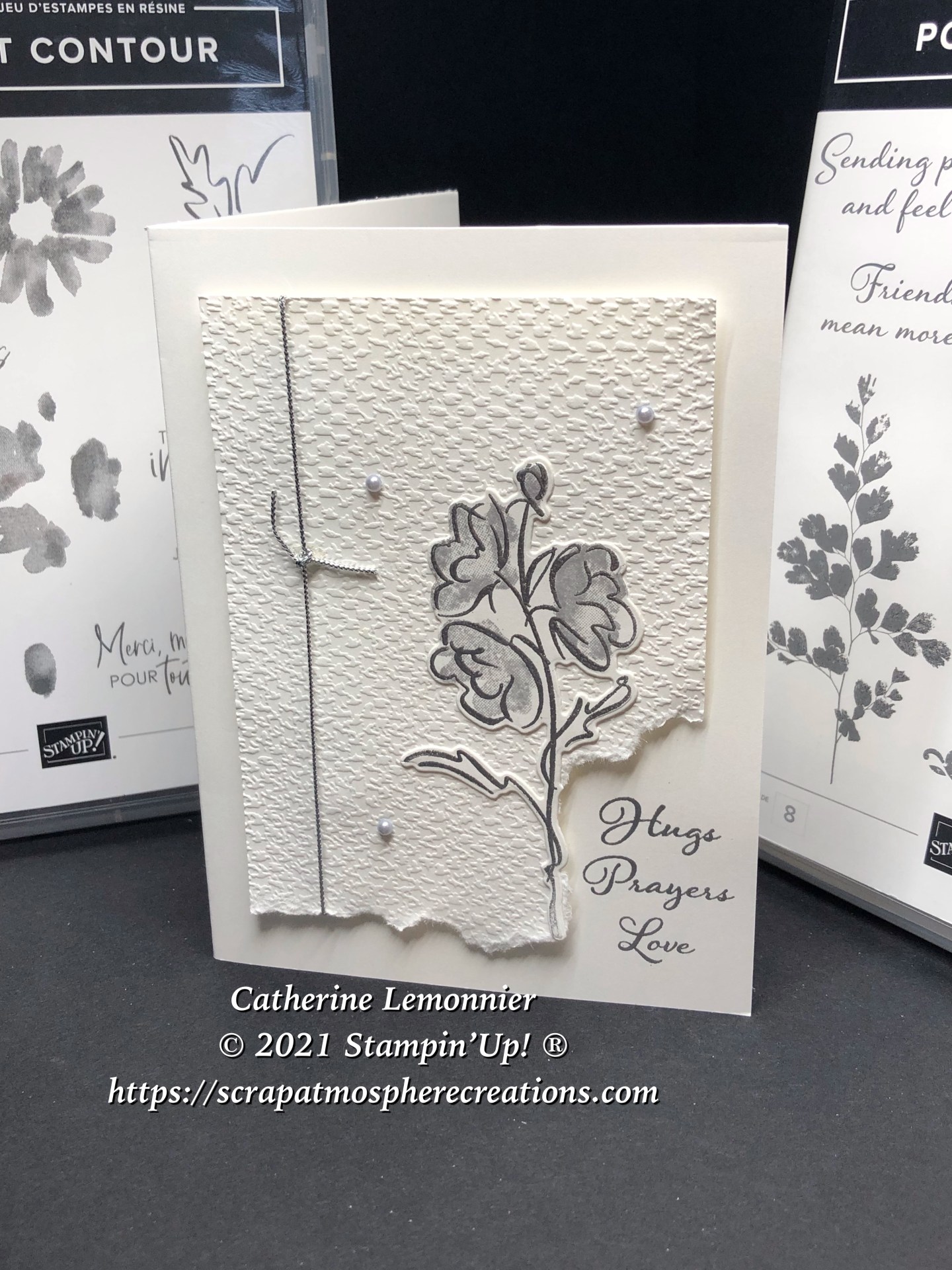 J’ai déchiré le fond en papier embossé pour laisser apparaître le message que j’ai également embossé à chaud sur la base de carte. Déchirure du papier, déchirure liée au départ d’un être cher… j’ai aimé cette symbolique…Le message vient du set de tampons Positive Thoughts (page 76 du catalogue annuel).