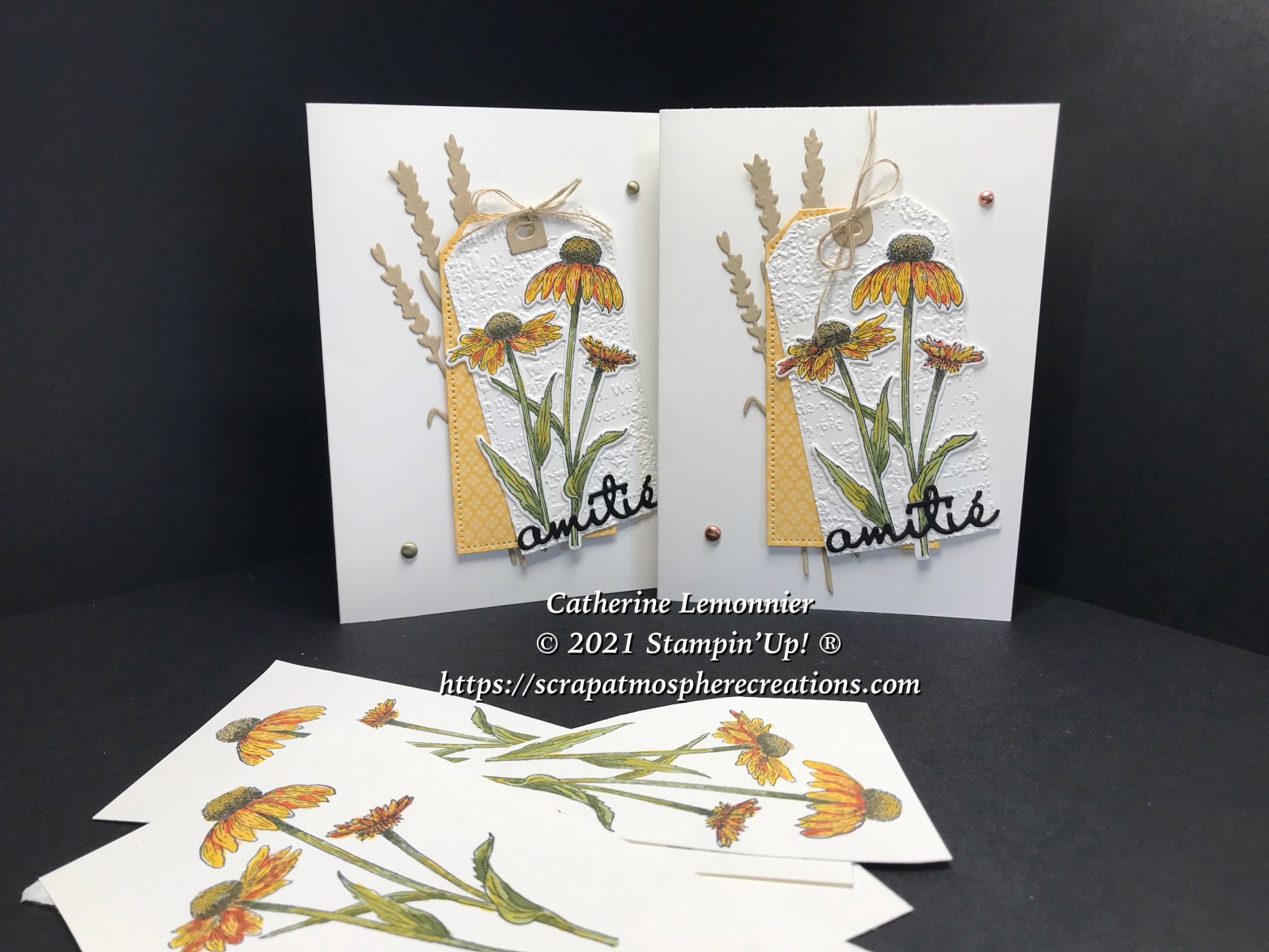 Vous avez probablement déjà feuilleté le mini catalogue Juillet-Décembre ? Alors qu’en dites-vous ? Que de belles choses n’est-ce-pas ? J’étais en vacances lorsque toutes ces merveilles sont sorties alors je n’ai pas encore beaucoup travaillé avec toutes ces nouveautés, et je l’avoue, j’ai un peu de mal à me projeter dans l’ambiance de Noël en cette période estivale… alors pour cette petite carte que j’ai faite pour accompagner les catalogues que j’ai remis à mes clientes, j’ai préféré travailler avec cette très jolie collection automnale, la collection Récolte des Prés, une de mes collections « coup de coeur » de ce mini catalogue . J ‘adore notamment les poinçons « silhouettes de fleurs », et le superbe plioir « Mots usés par le temps » , et aussi les Pois autocollants en métal brossé…bref l’ensemble de la collection en fait !