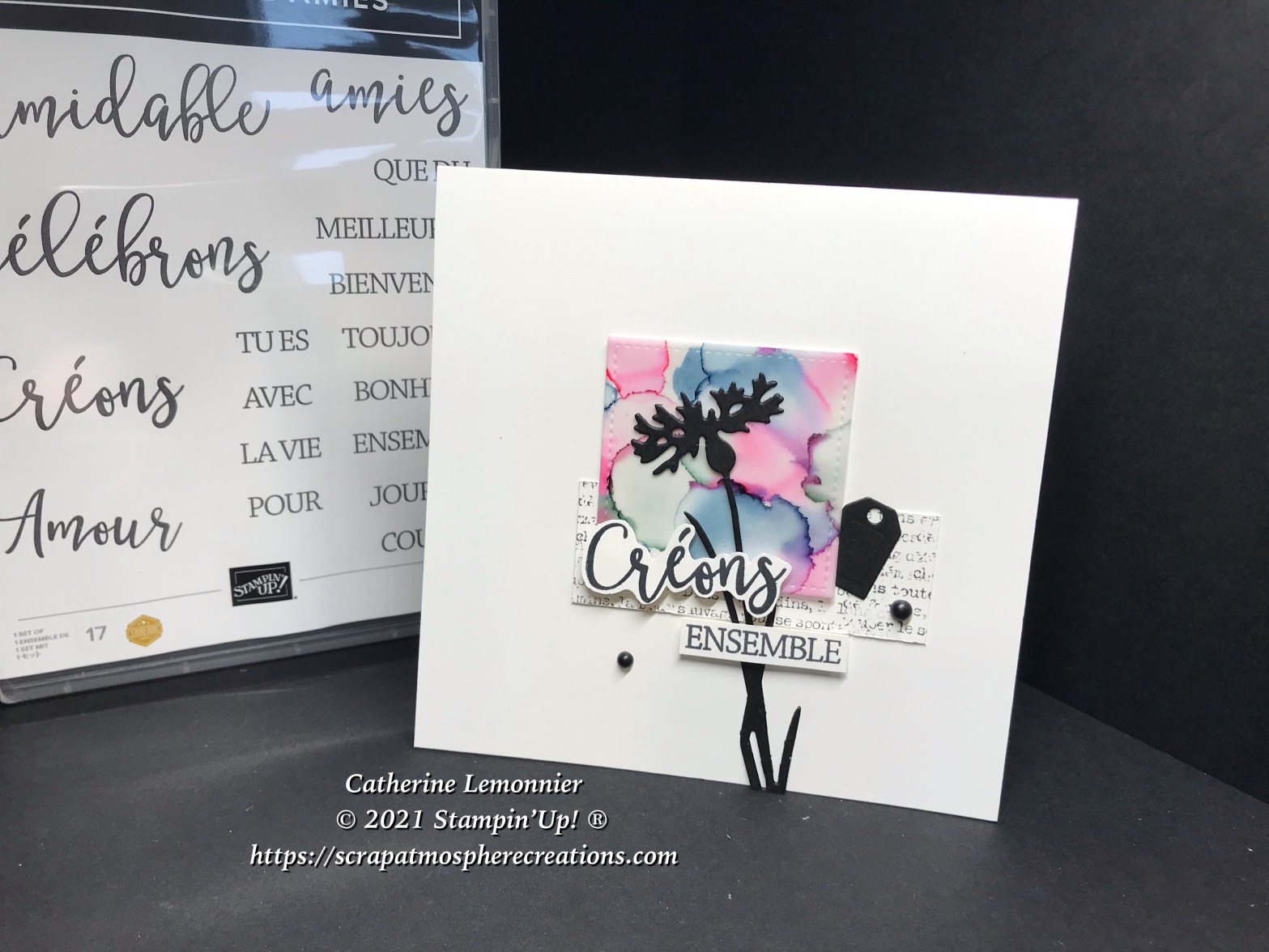 Alors pas question de laisser passer cette journée mondiale de la carterie sans une création ! Voici donc la carte que j’ai créée spécialement pour cette journée, je l’offre symboliquement à tous ceux et celles qui partagent mon intérêt pour la carterie, et plus largement pour les loisirs créatifs ! Cette création m’a permis de mettre en lumière un set de tampons que je n’avais pas encore eu l’occasion d’utiliser, et qui porte un nom parfaitement adéquat : Créer entre amies…Vous pourrez le trouver page 36 du catalogue annuel, j’adore associer des mots avec des polices différentes, je trouve que l’effet est très sympa !
