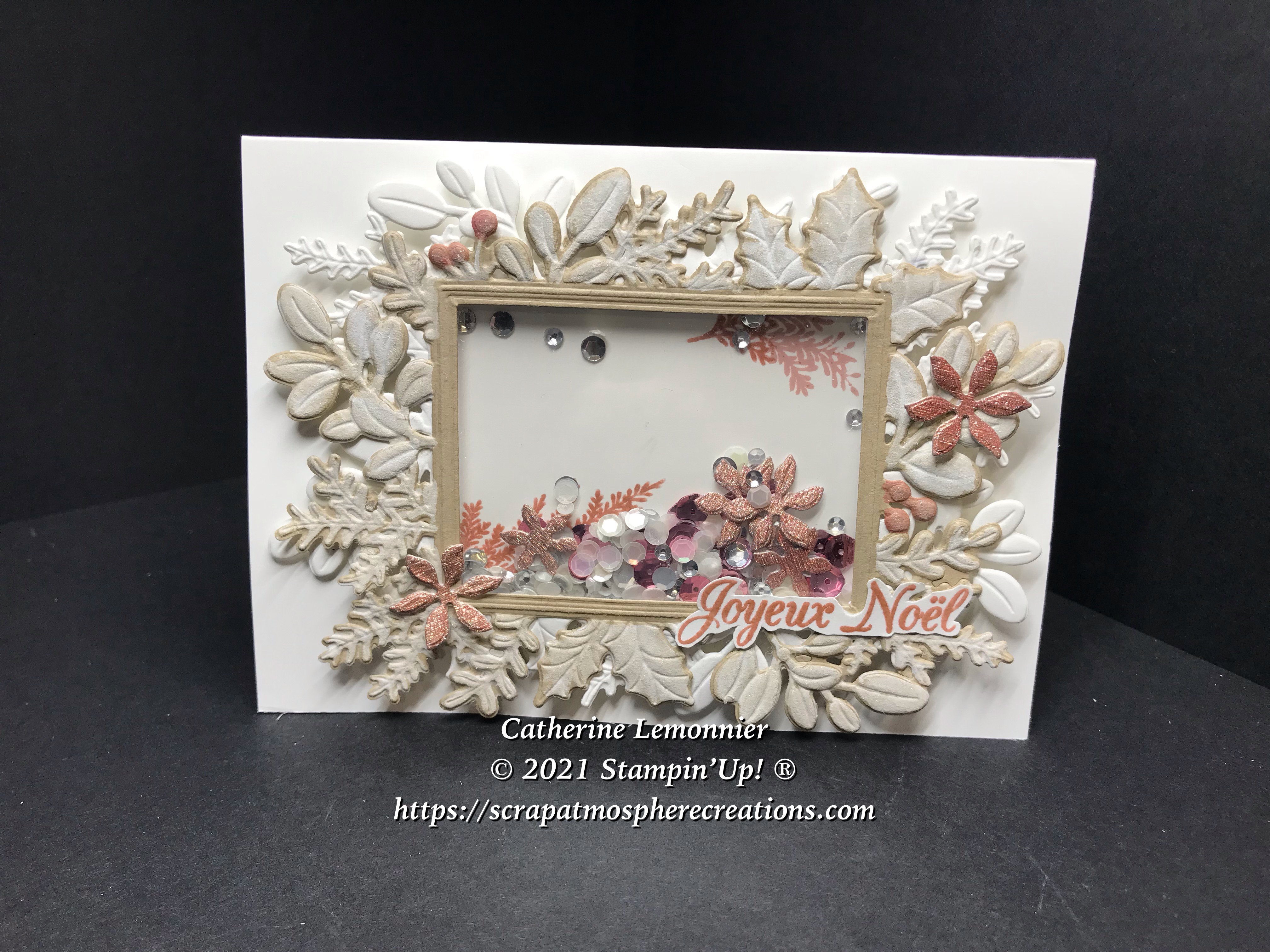 Aujourd’hui je vous présente les créations proposées dans mon dernier atelier, une boîte en deux versions, qui contiendra des chocolats ou autres…et une carte à secouer. Les trois projets utilisent globalement les mêmes « ingrédients » et la même technique. Pour ces créations j’ai mis à l’honneur le Plioir à gaufrage hybride Cadres Festifs, association entre des poinçons et un plioir que l’on utiliser en un seul passage de machine de découpe.