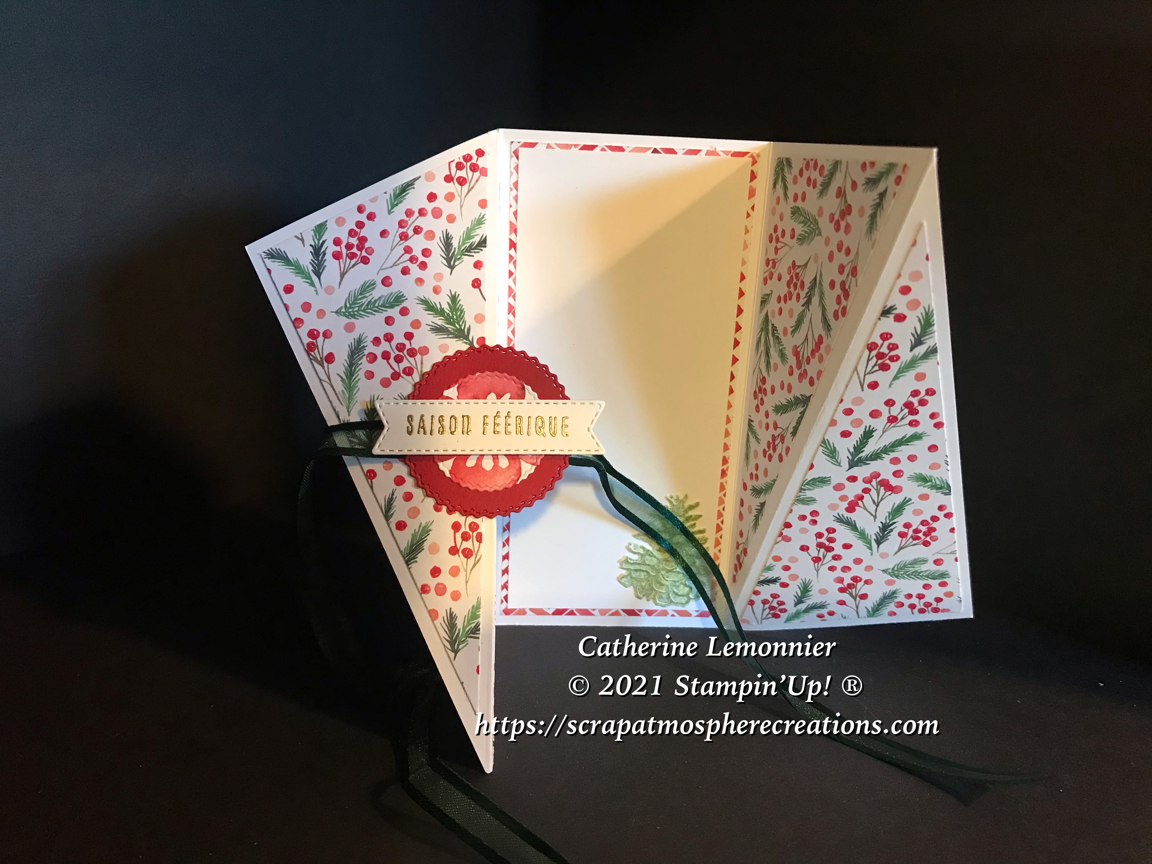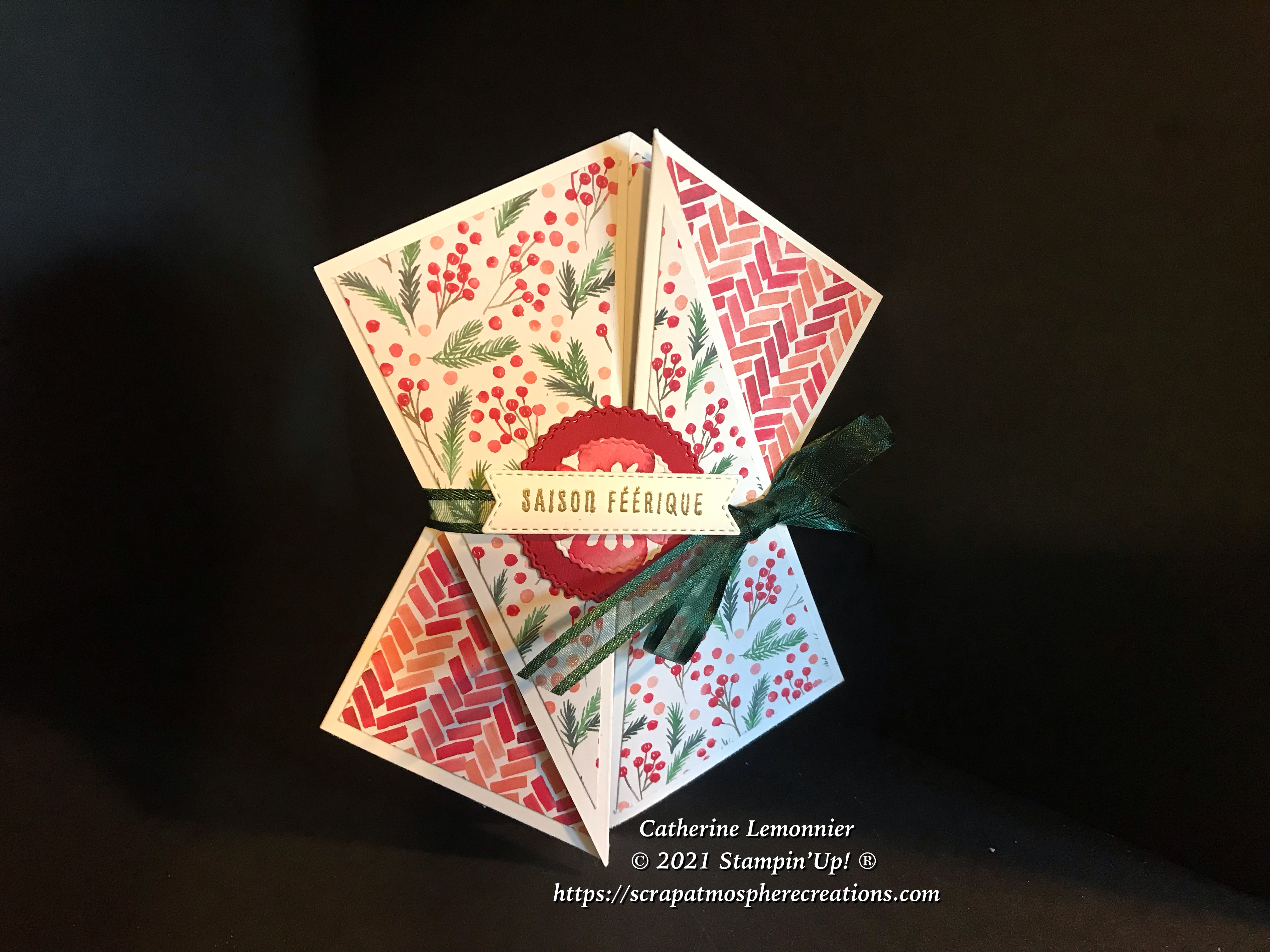 Pour cette version j’ai mis à l’honneur la collection de papiers Splendide Fantaisie de Stampin’Up!, et j’ai fait un second modèle avec les papiers Noël en peinture, aux couleurs plus traditionnelles…