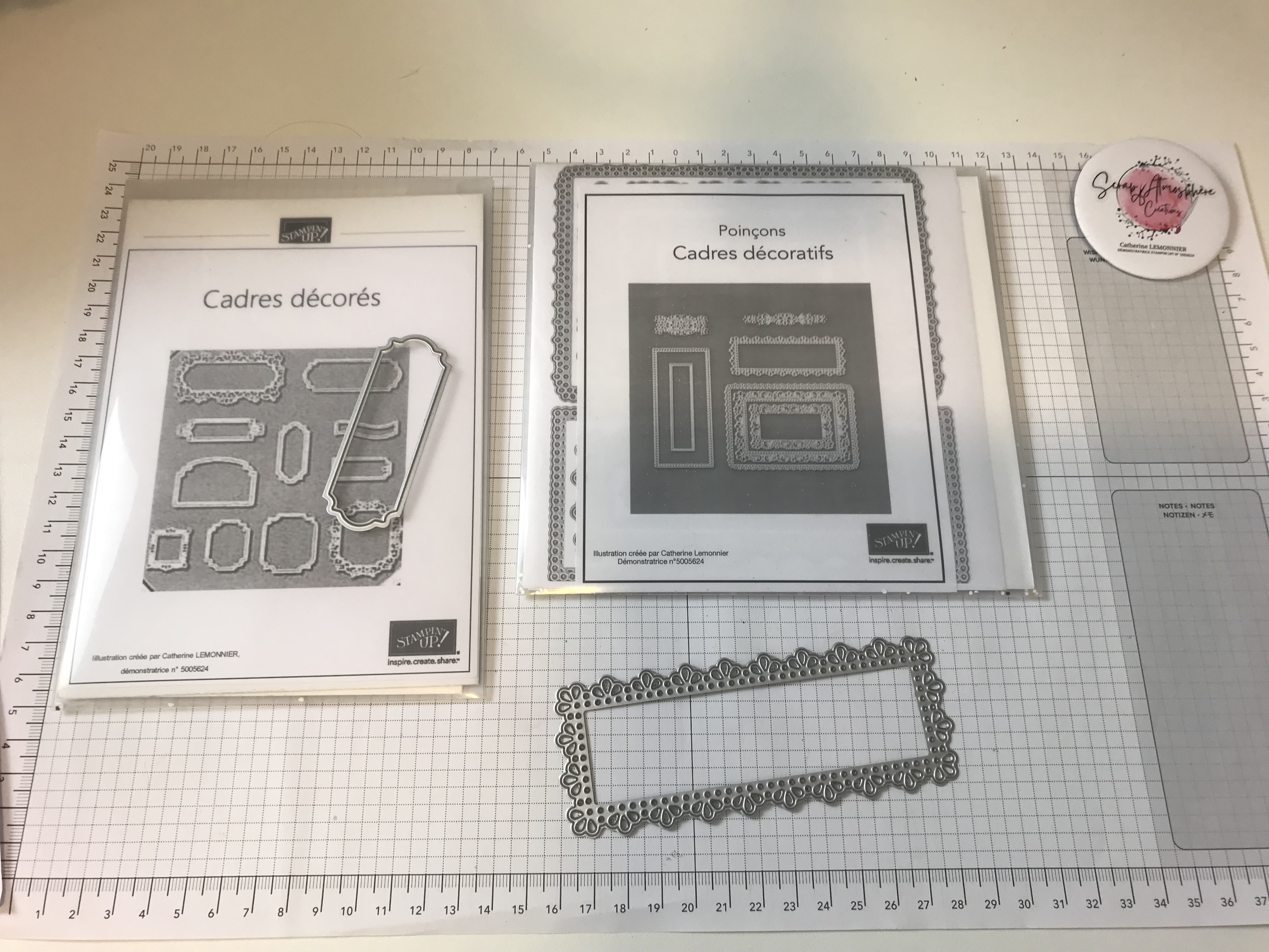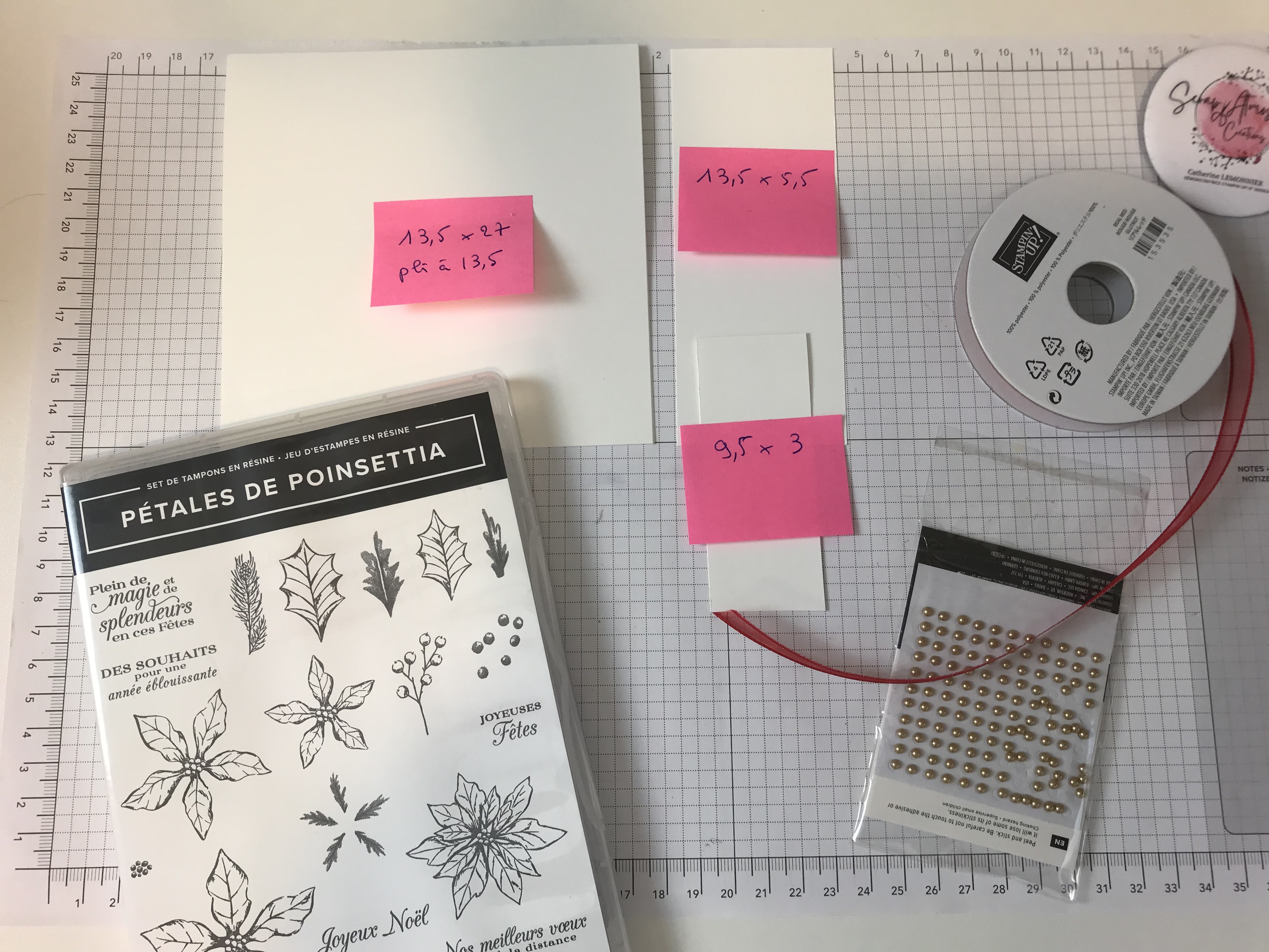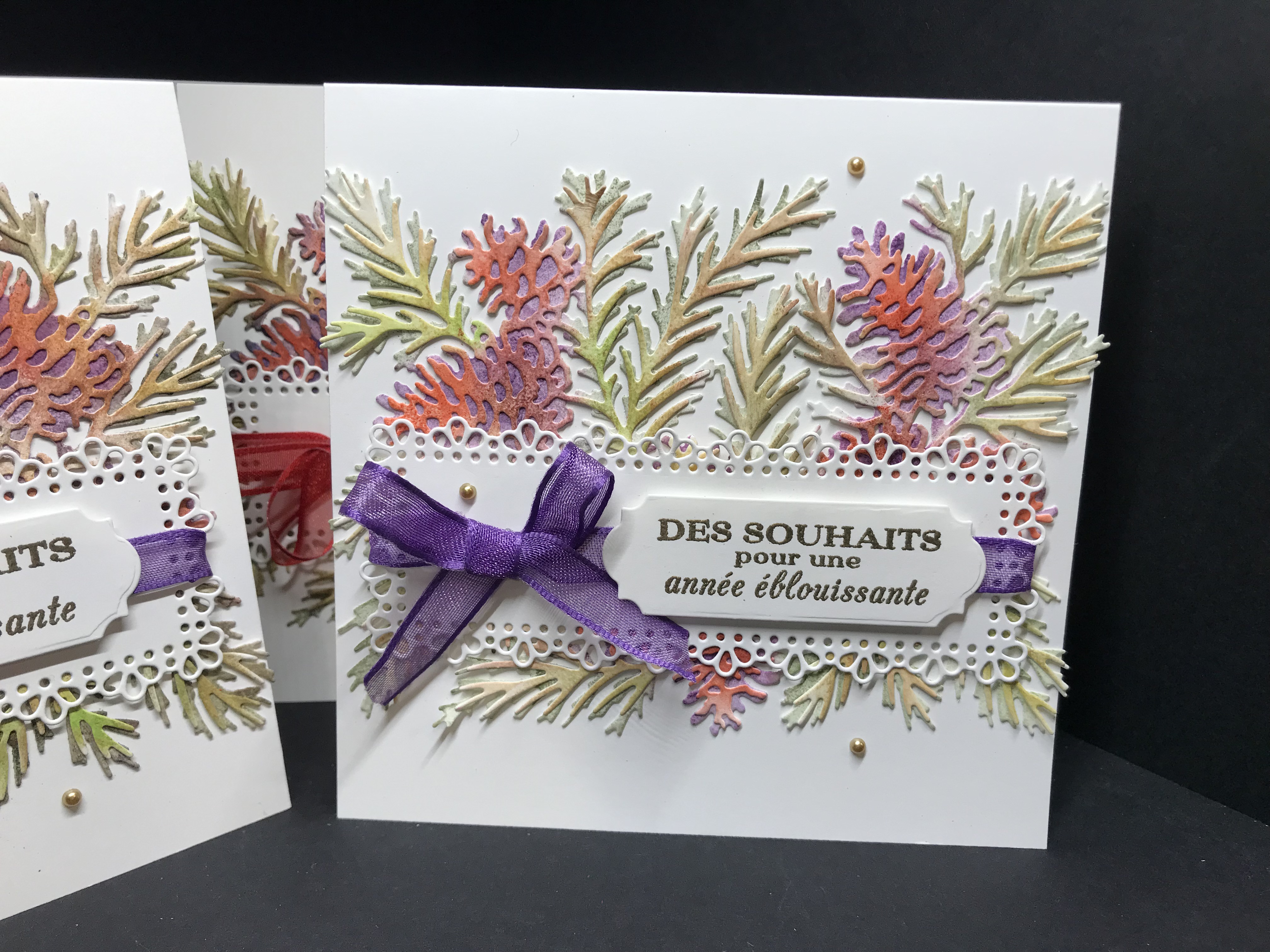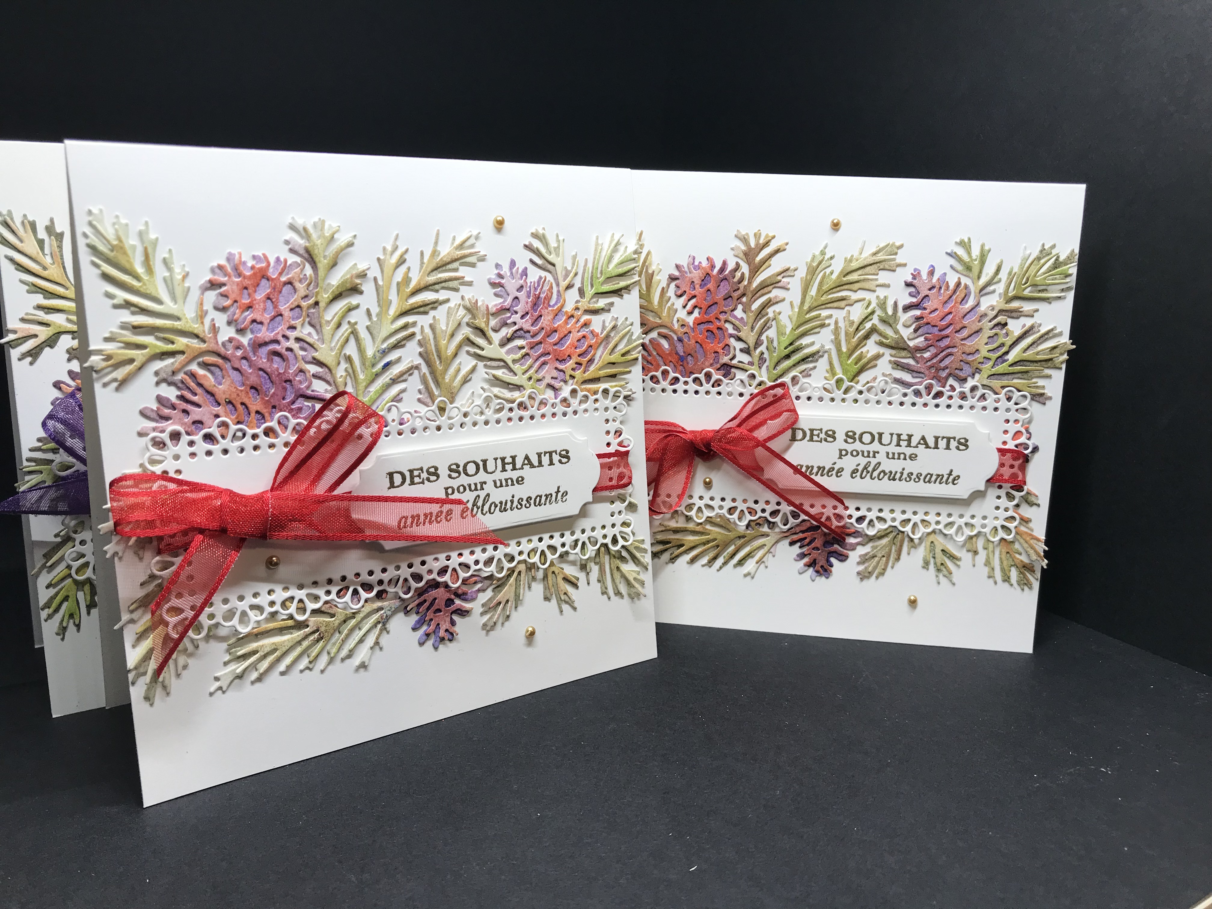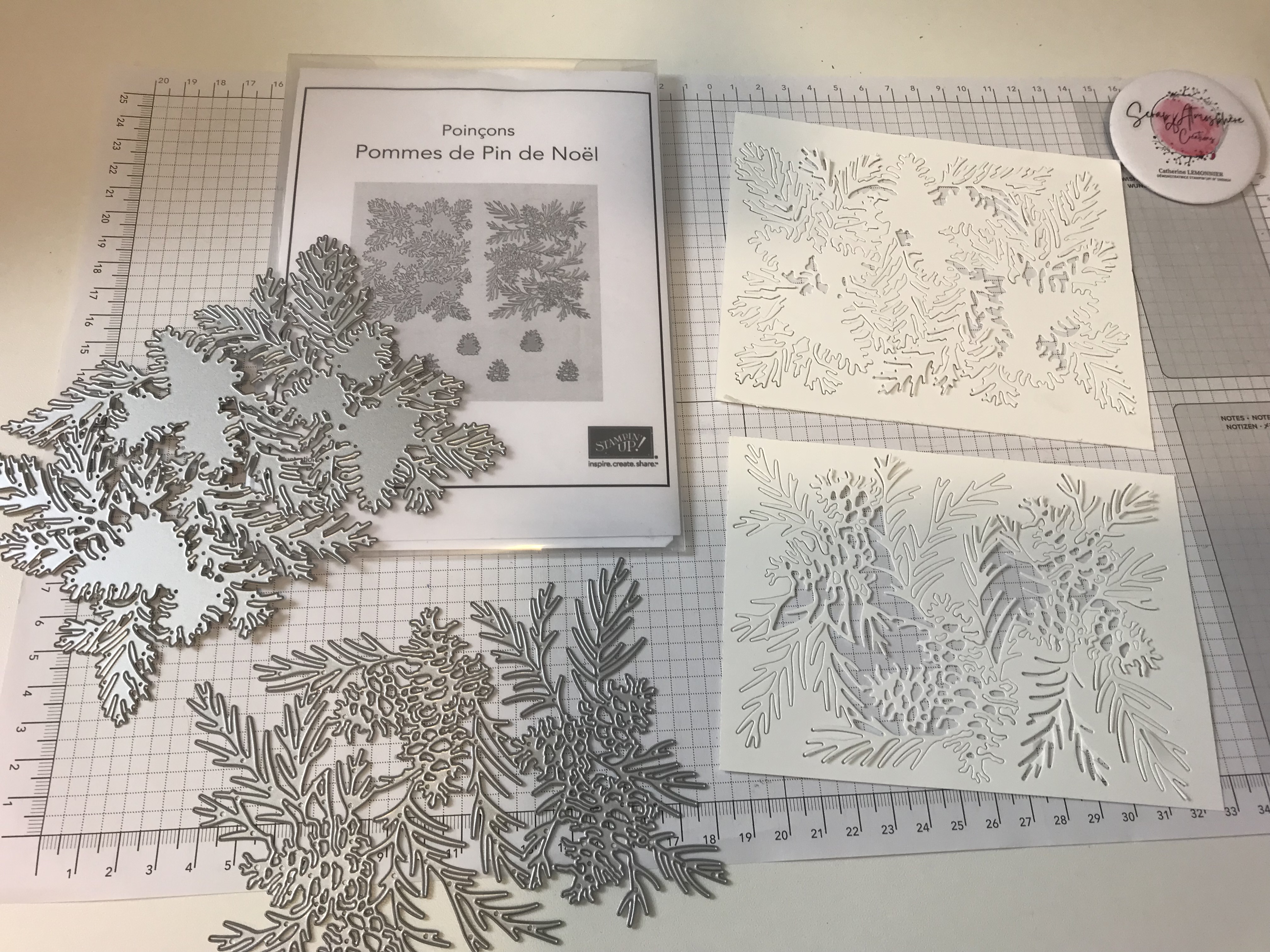 Pour que cette technique soit particulièrement parlante, j’ai choisi de travailler avec les poinçons Pommes de Pin de Noël, dont les deux grands poinçons se superposent pour des combinaisons de couleurs sans limites…