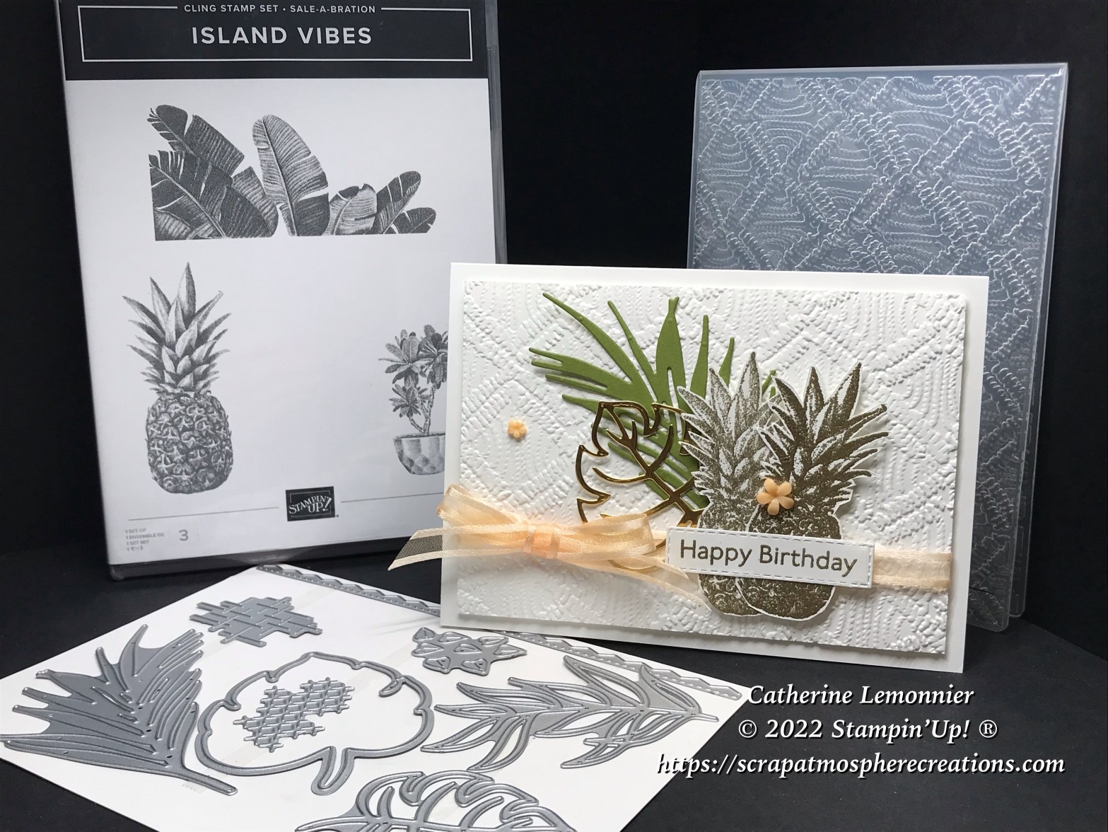 Ensuite j’ai noué un morceau de Ruban à tissage léger Papaye Pâle, puis j’ai disposé avec des Stampin Dimensionals deux ananas embossés avec de la poudre métallisée dorée que j’ai découpés avec mes petits ciseaux. Ces ananas sont issus du superbe set de tampons Island Vibes qui était offert pendant Sale a Bration.