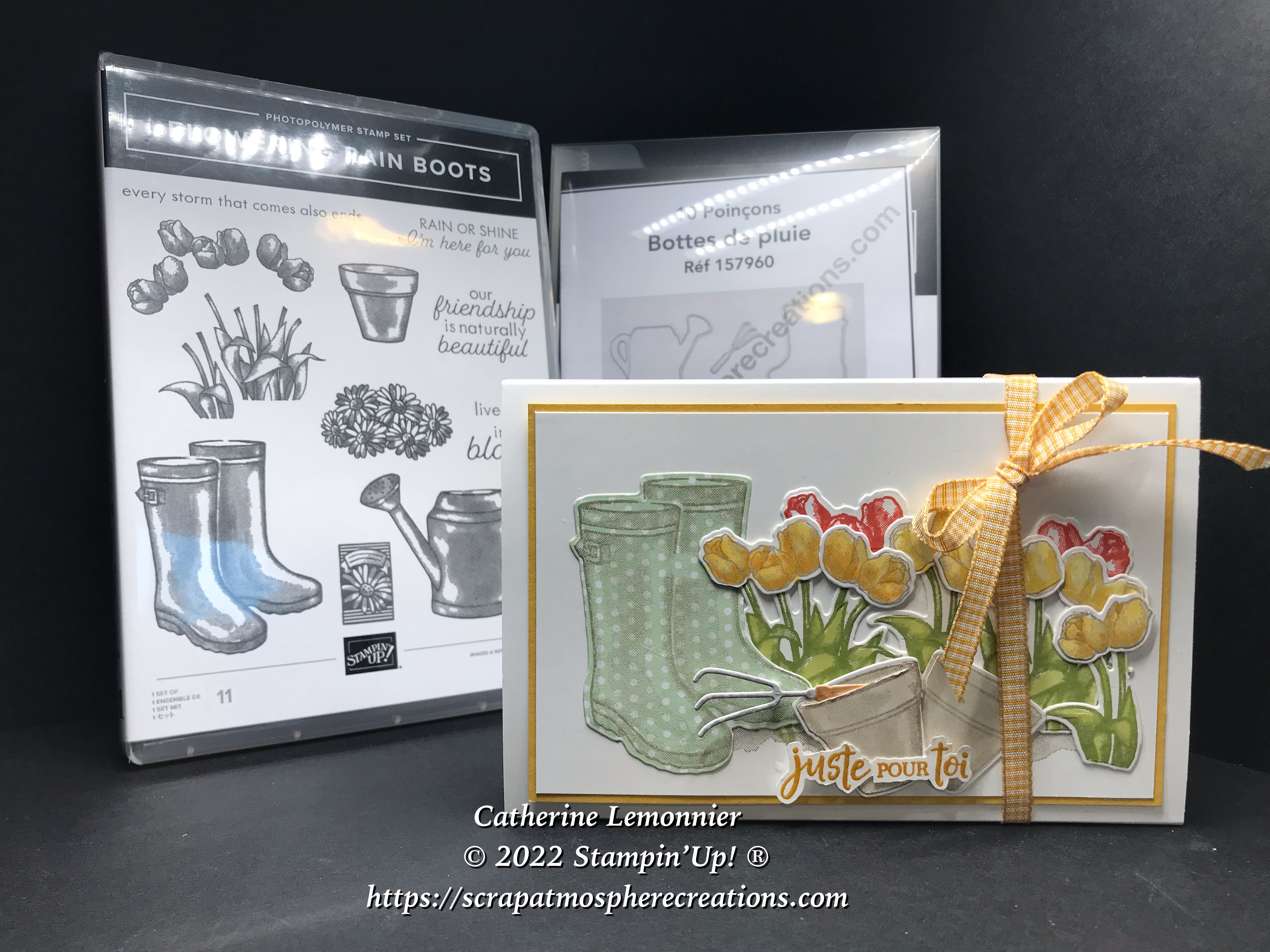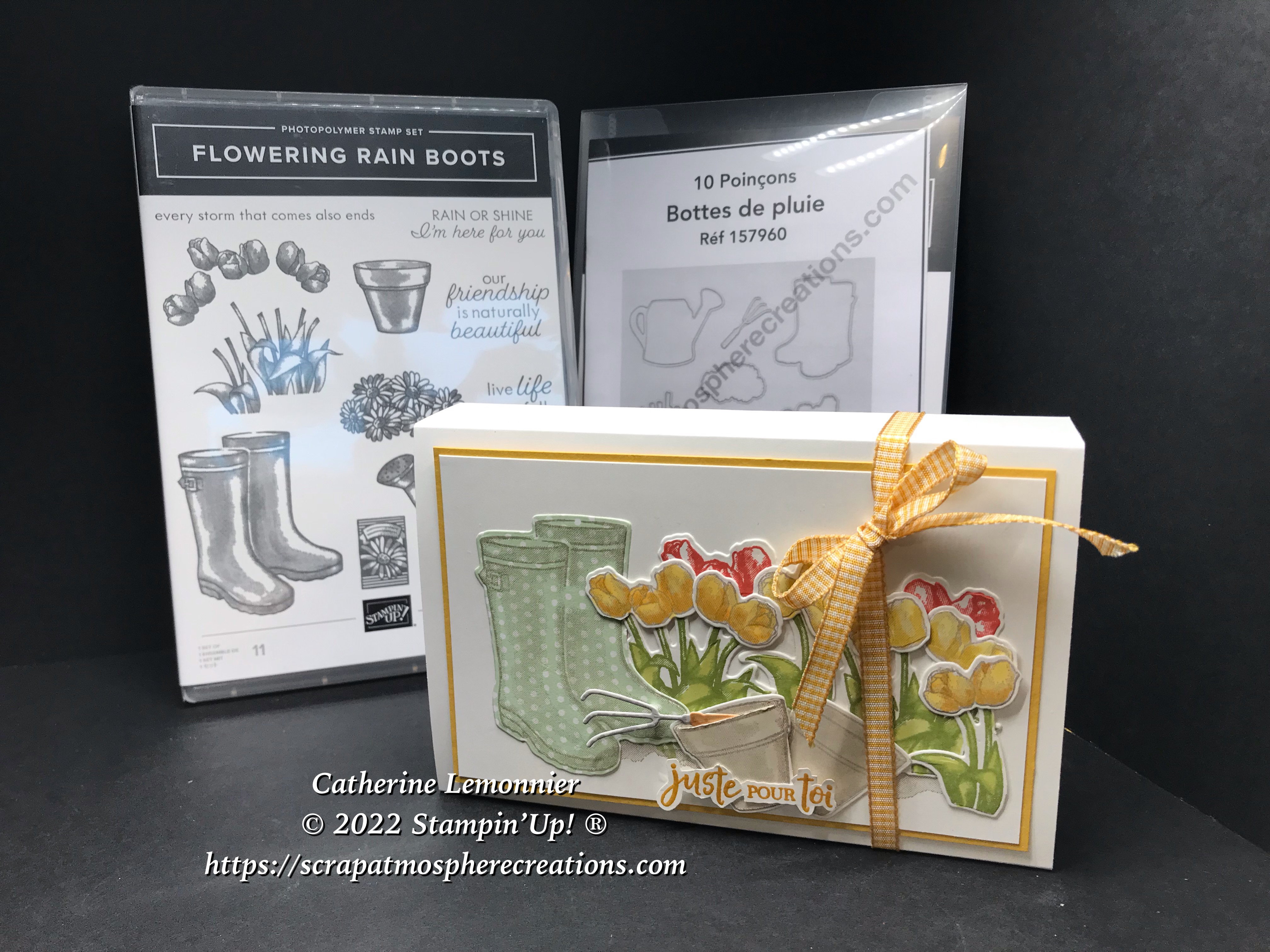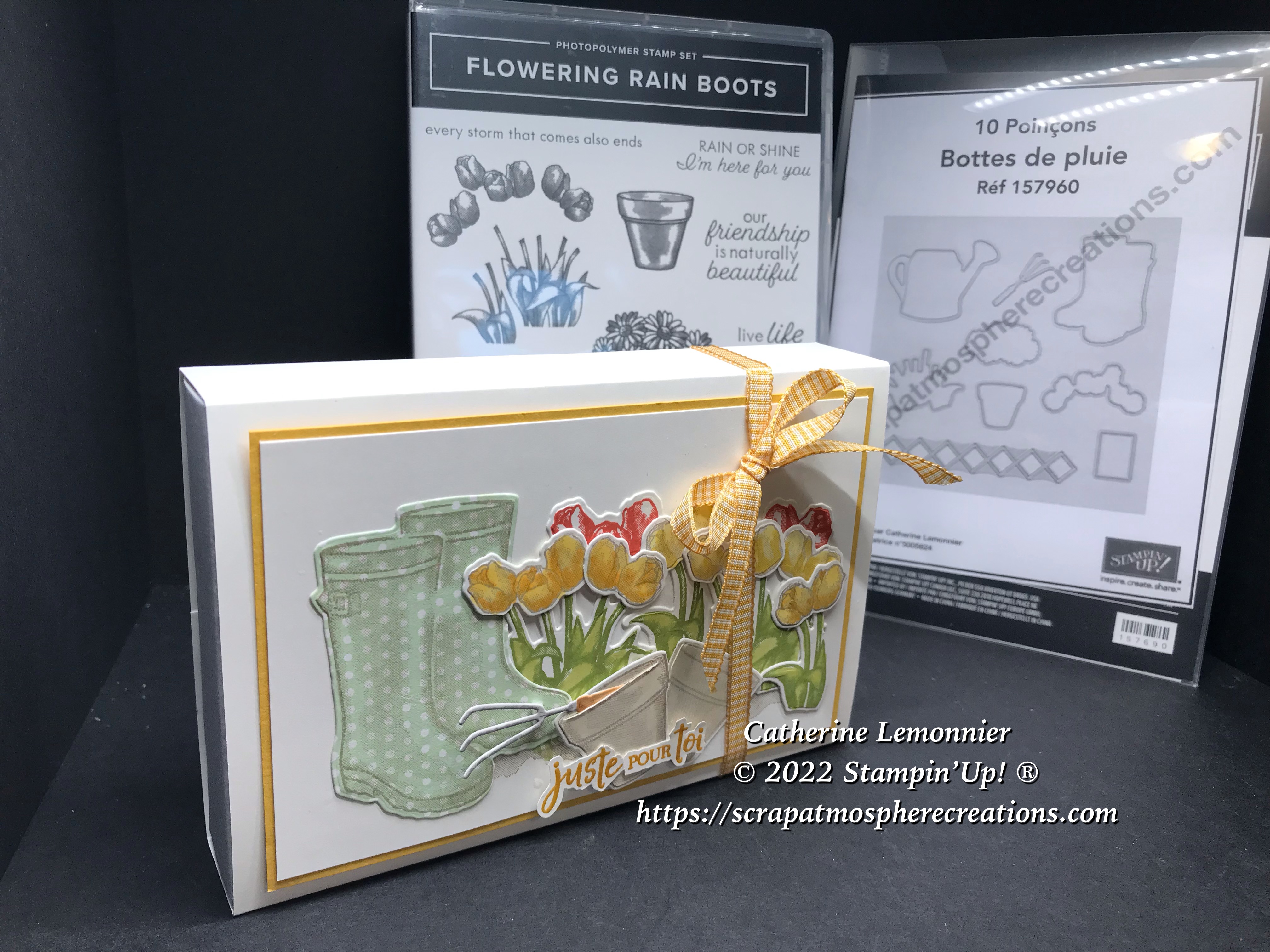 Je me suis encore bien amusée à composer cette scène avec les Superbes tampons Flowering Rain Boots et les poinçons Bottes de pluie…Notez que j’aurais pu décliner cette boîte en version carte également !