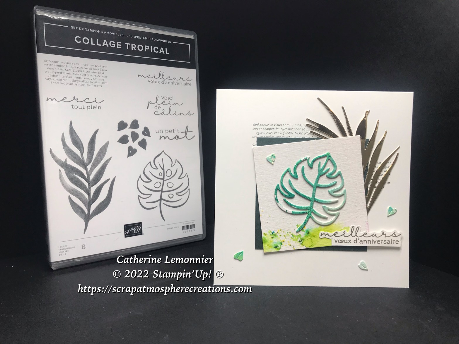 J’ai d’abord fait un fond avec des encres puis après séchage j’ai découpé dans ce fond la feuille et les coeurs. J’ai également fait un fond très partiel avec des pigments sur du papier aquarelle, sur lequel j’ai collé la feuille et un coeur. Ce carré de papier aquarelle est adossé sur un carré de papier cartonné Epinette Enivrante. Entre les deux, une grande feuille découpée dans du papier métallisé Or. Et en arrière-plan vous pouvez voir un tampon « écriture » du set de tampons Collage tropical que j’ai tamponné à deux reprises, avec l’encre Epinette Enivrante également. Le souhait, du même set de tampons lui aussi, est embossé avec de la poudre Or.