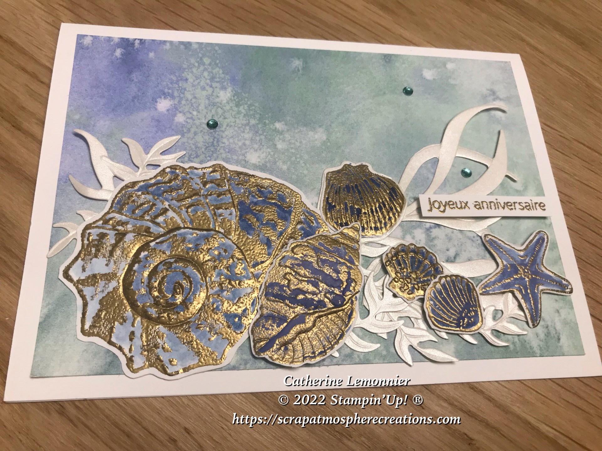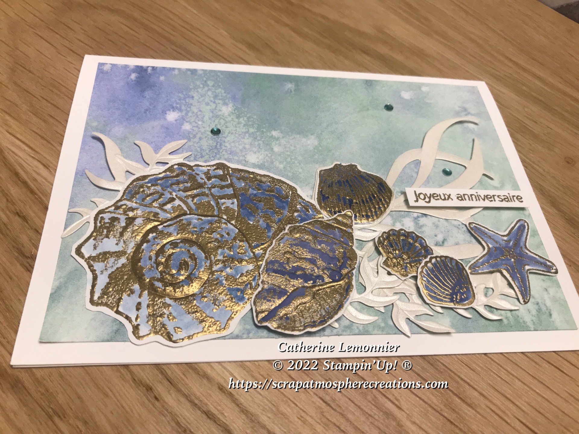 Est-ce l’effet « mer et plage » de mes récentes vacances ? (c’est en tout cas plus poétique que l’effet « plateau de fruits de mer » au restaurant pendant les vacances, vous ne trouvez pas ?) , bref je reviens à mon sujet principal, cette carte d’anniversaire réalisée à nouveau avec le magnifique ensemble Coquillages et bord de mer…