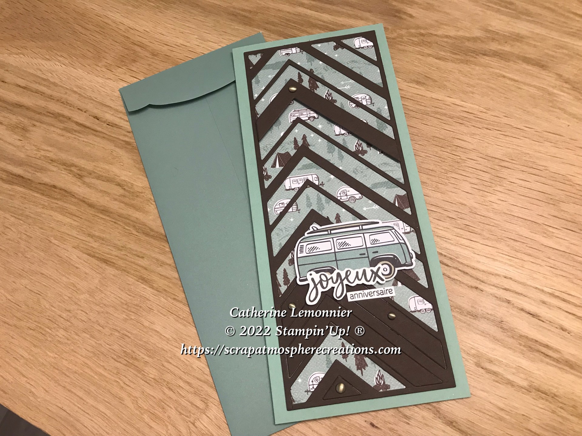 J’ai repris les couleurs principales du papier design choisi : Soyeuse Succulente pour la base de carte, et Couleur Café pour la découpe. En plus, j’ai pu assortir avec une des enveloppes « Carte Etroite » (page 137 du C.A.)