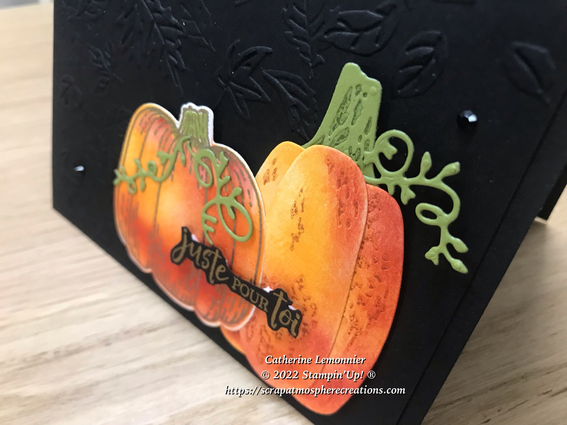 Les deux citrouilles sont adossées sur du papier Noir Nu que j’ai embossé avec le plioir à gaufrage 3D Feuilles en cascade…son rendu est superbe, on dirait presque du velours sur le papier noir…