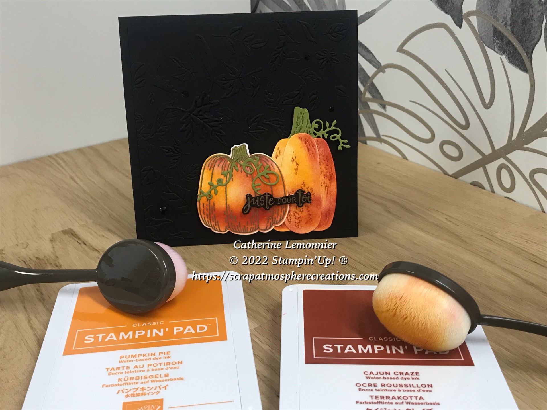 Je me suis fait vraiment plaisir en utilisant ce lot qui offre plein de possibilités techniques et en coloriant les citrouilles avec les brosses à estompe…Les encre utilisées sont Tarte au Potiron, Ocre Roussillon, et Vert Olive pour les queues et les vrilles. La citrouille ronde a été embossée à chaud avec de la poudre Or sur du papier Blanc Simple, avant colorisation. Pour la seconde citrouille il n’y a pas de tampon, elle est composée de 3 découpes (ou 4 avec la vrille).