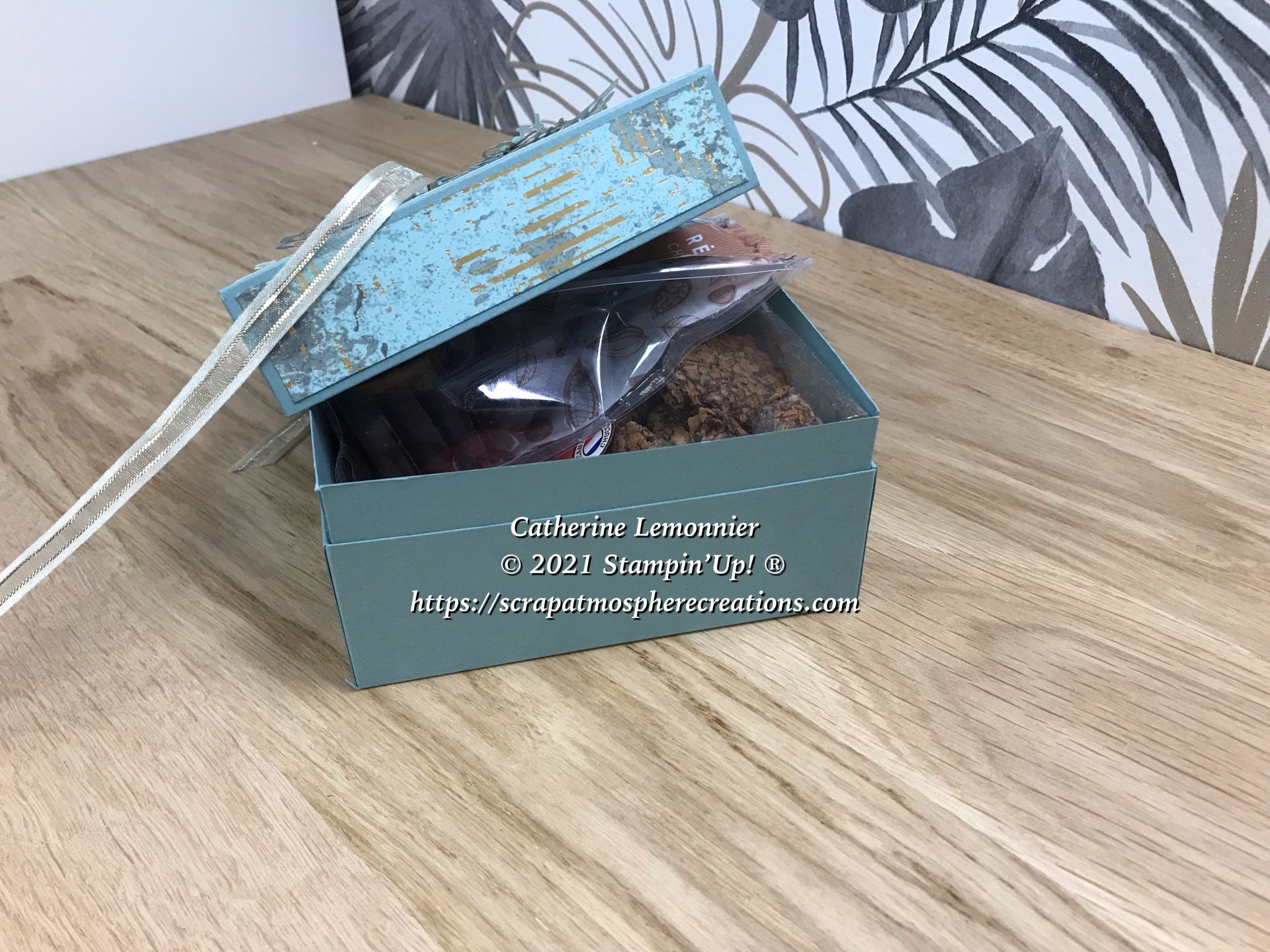 Dans cette boîte de contenance très confortable j’ai placé deux sachets de chocolats. J’en aurais mis davantage « en vrac », mais dans ce cas il faut impérativement tapisser l’intérieur de la boîte avec du papier sulfurisé, pour protéger la boîte d’une part, et parce que le papier cartonné n’est pas forcément propre au contact alimentaire d’autre part. Compte tenu des dimensions de la boîte j’aurais pu également y mettre des petits gâteaux faits maison, des financiers, des cookies, etc…toujours avec le conseil du papier sulfurisé, ou bien en utilisant un sachet en cellophane fait pour cet usage…
