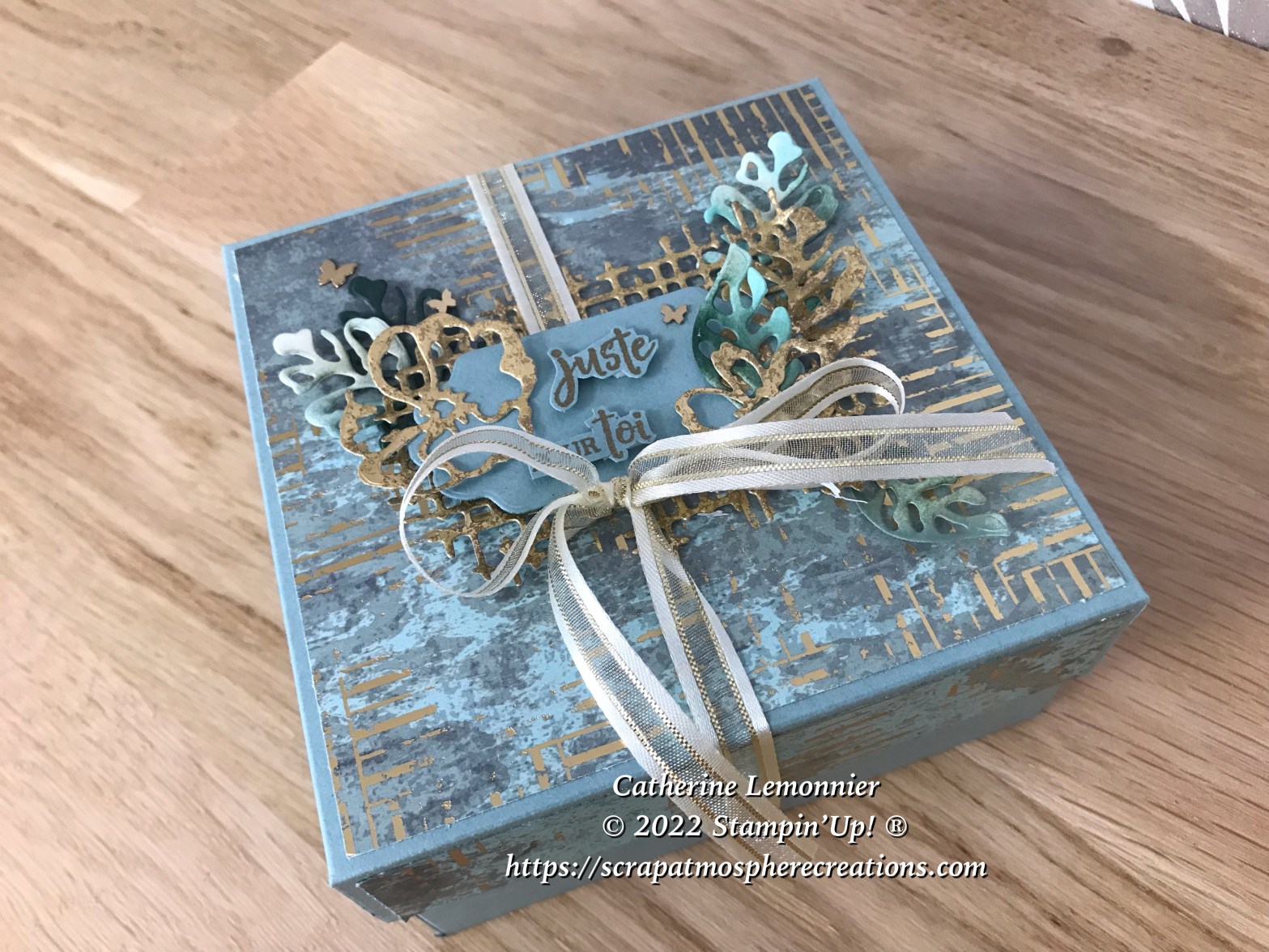 Cette fois j’ai voulu utiliser d’autres couleurs, avec un décor différent, la première boîte étant franchement orientée vers Noël…du coup, cela me permet de vous proposer deux versions différentes de la même boîte !
