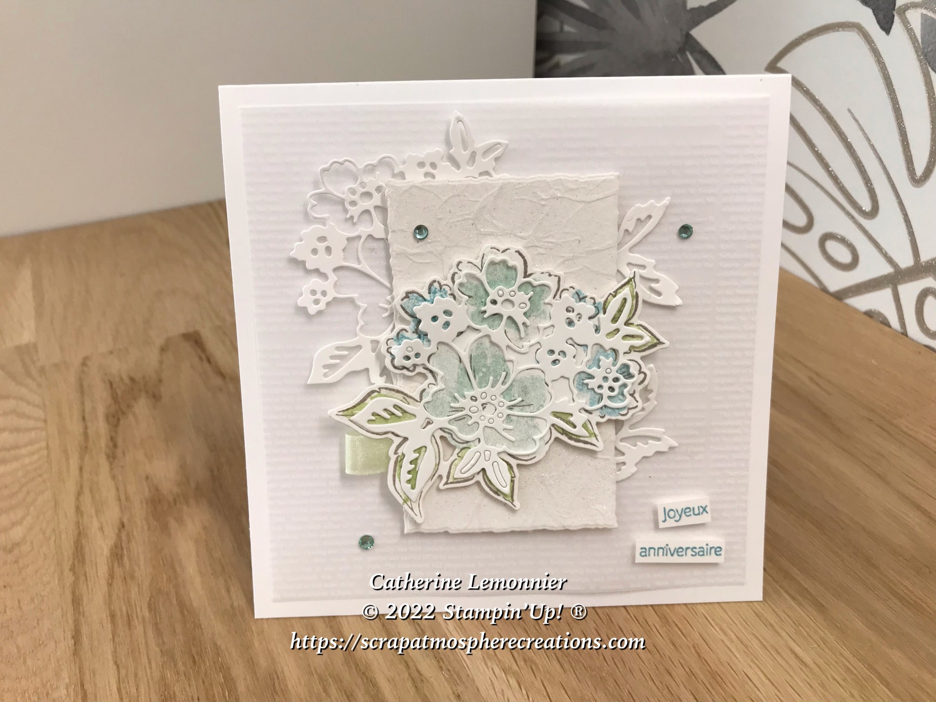 Celui-ci est adossé sur un carré de papier vélin « Impressions à superposer » (p. 139 du catalogue annuel), il habille le fond de carte en papier Blanc Simple, mais tout en transparence, discrètement, pour laisser la vedette au décor.
