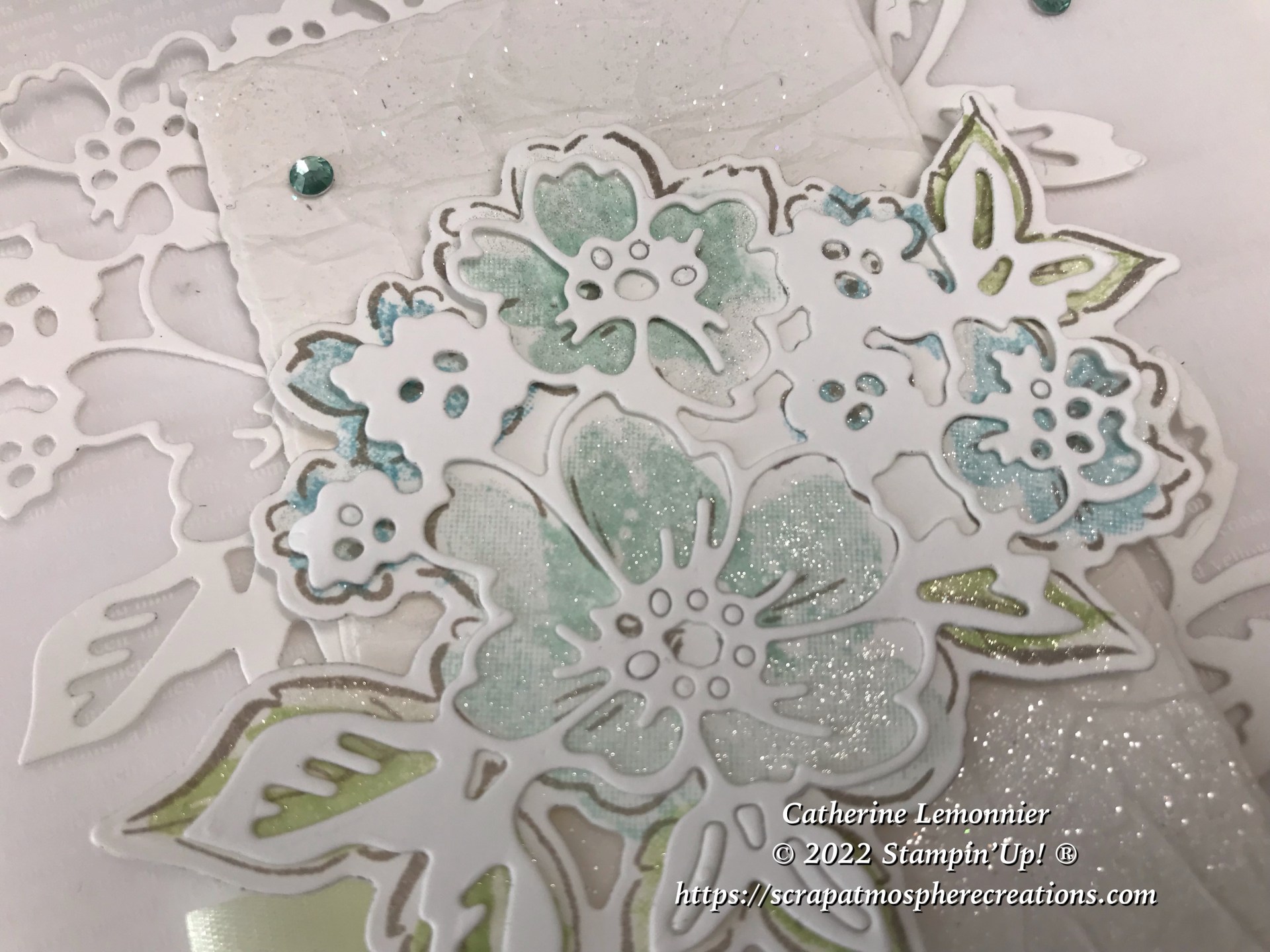 Entre le papier vélin et le rectangle en papier de soie, j’ai glissé des éléments découpés avec les poinçons Fleurs enclavées dans du papier Blanc Simple, pour donner davantage de profondeur à la composition…