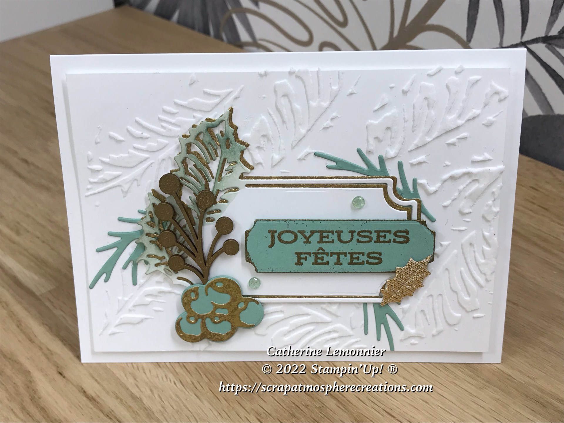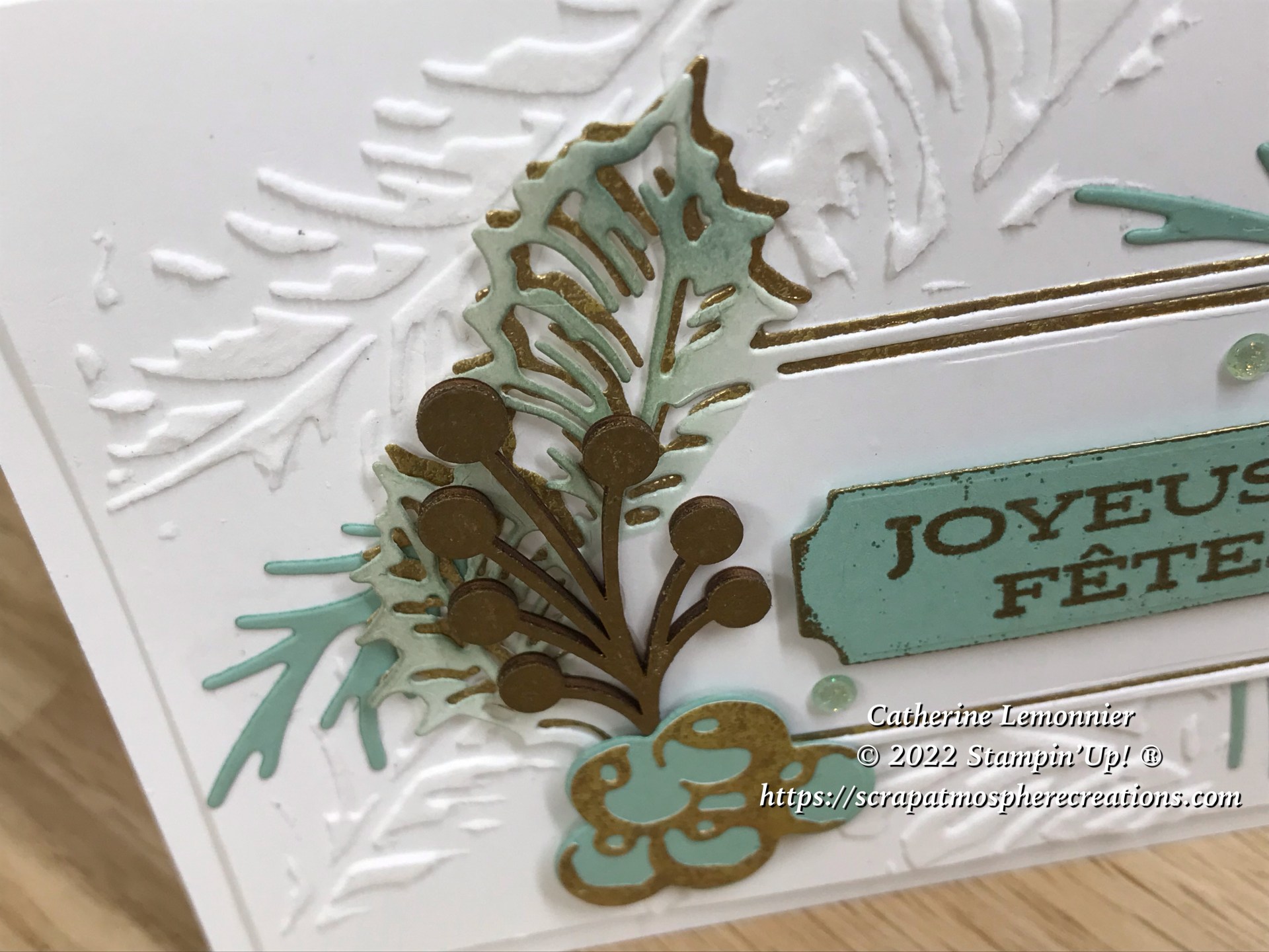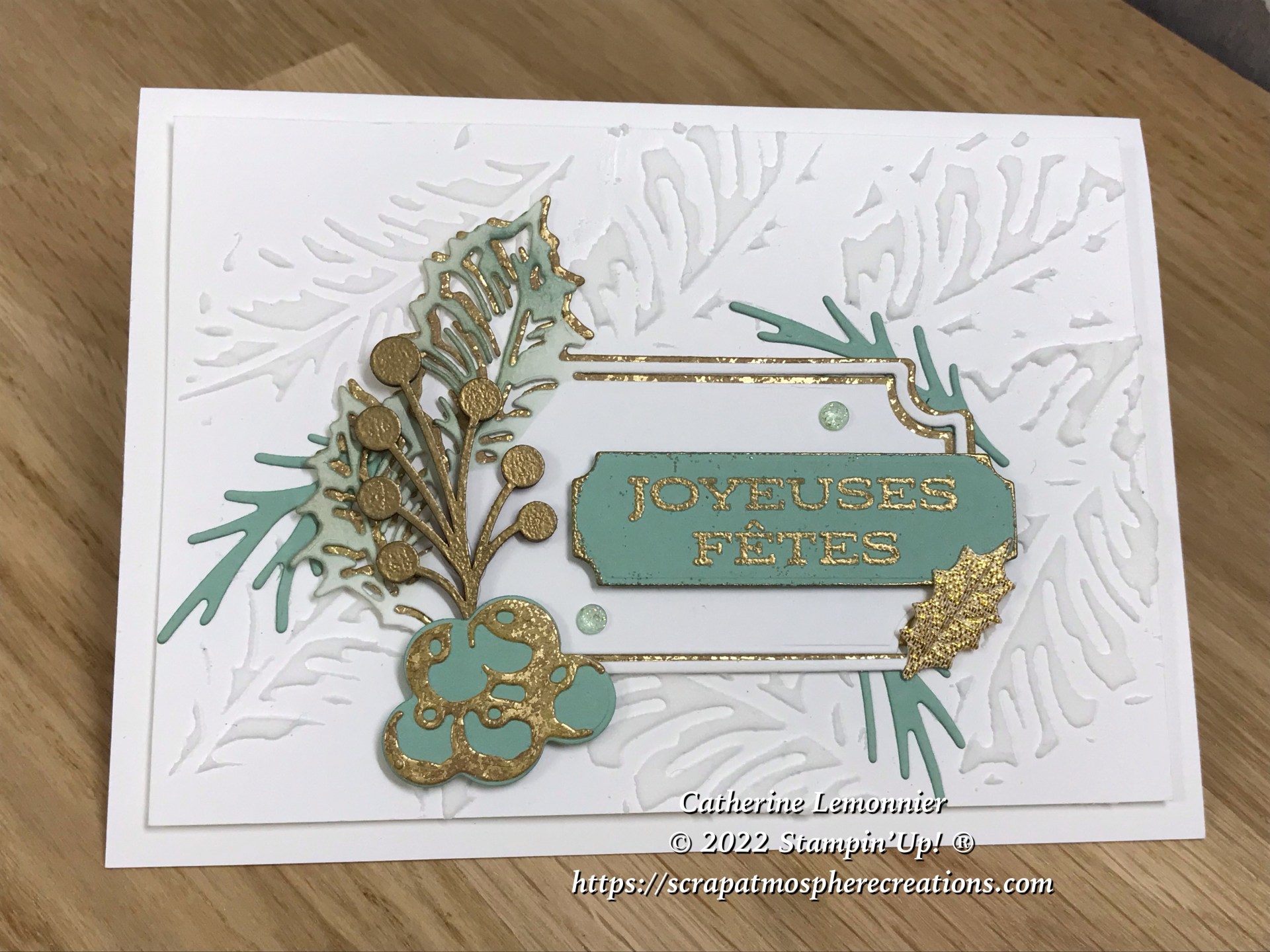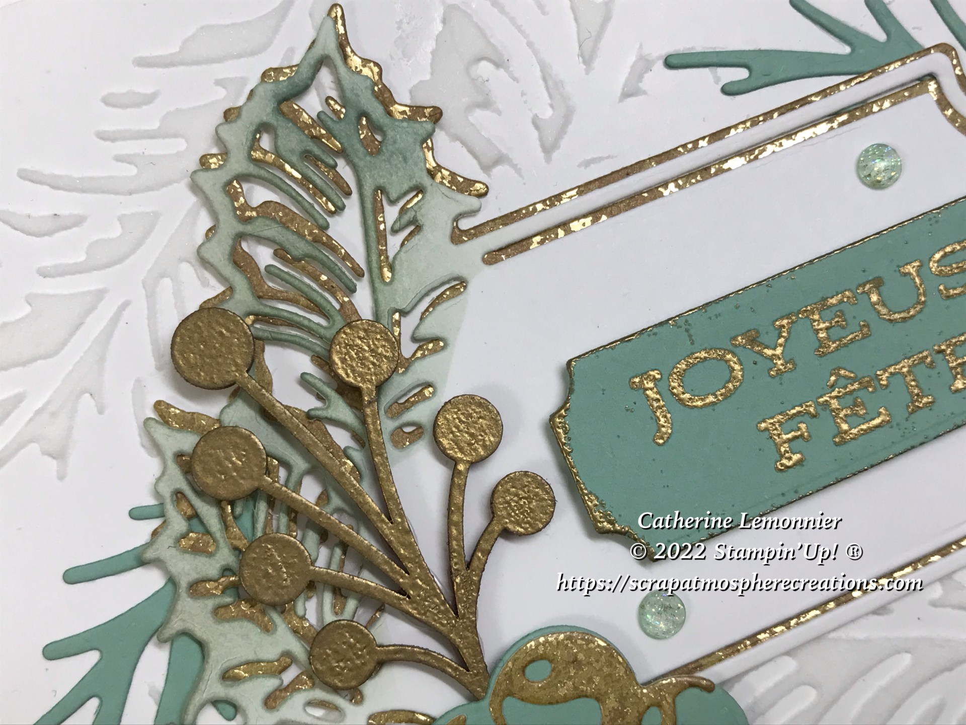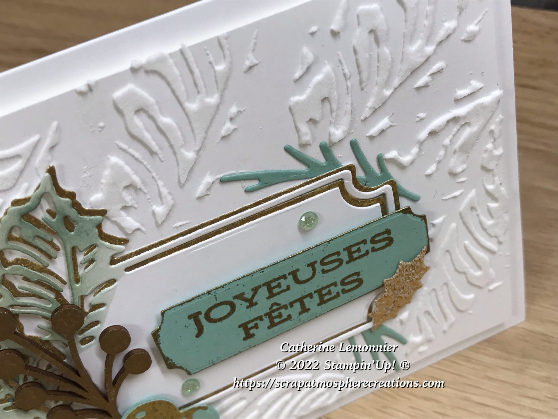 Voilà, pendant que l’on préparait tout cela notre fond de carte avait séché, et on pouvait finaliser. On commence par disposer les petites feuilles de façon à occuper des espaces libres entre les zones couvertes de pâte à embosser. Il n’est pas nécessaire de couvrir tous les espaces libres, il faut que cela reste aéré (enfin pour moi). Ensuite on superpose les deux grandes étiquettes mais en créant un léger décalage de façon à laisser apparaître l’étiquette en or patiné à travers les espaces vides de l’étiquette blanche. Pour terminer, on colle l’élément en bois, les boules de houx, puis l’étiquette texte sur des Stampin Dimensionals, et enfin la petite touche de brillant avec des gemmes ou autres en harmonie avec les couleurs de la carte.