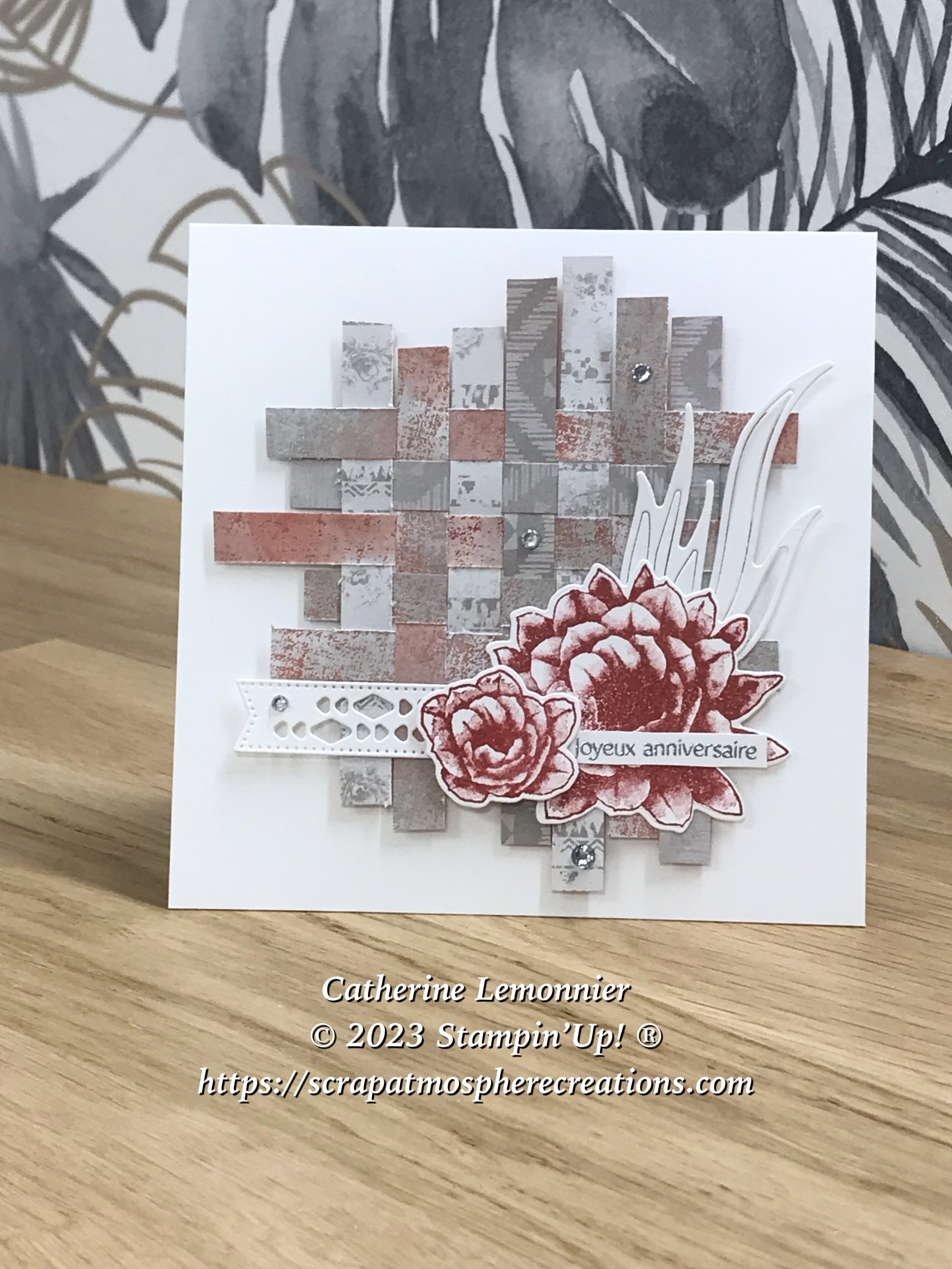 J’ai choisi des chutes de 3 papiers différents dans le papier Désert Délicat, et j’en ai fait des petites bandes de 1cm de large, mais de longueurs différentes, puis j’ai simplement entrelacé mes petites bandes de papier pour former ce tissage qui m’a servi de fond.