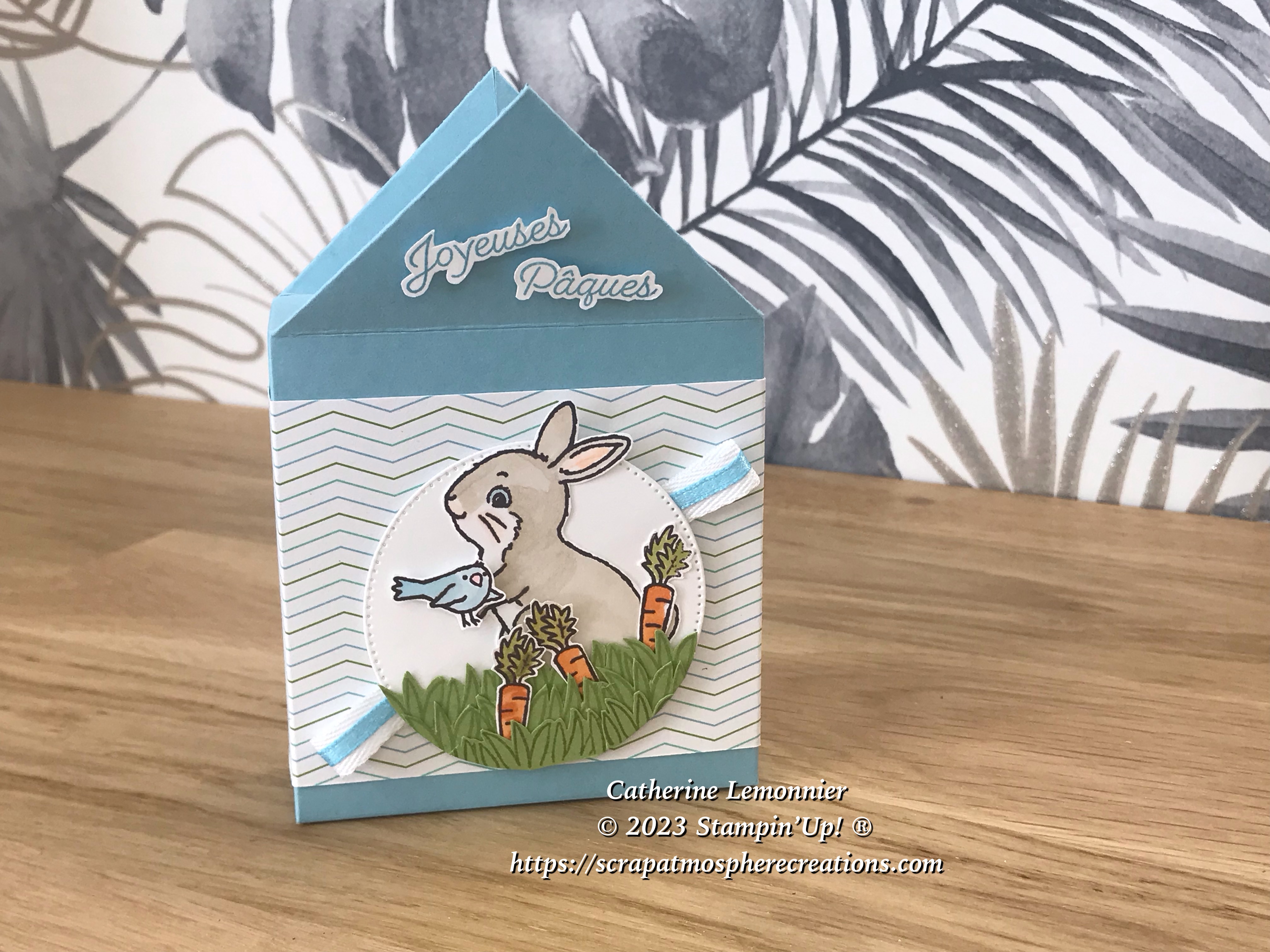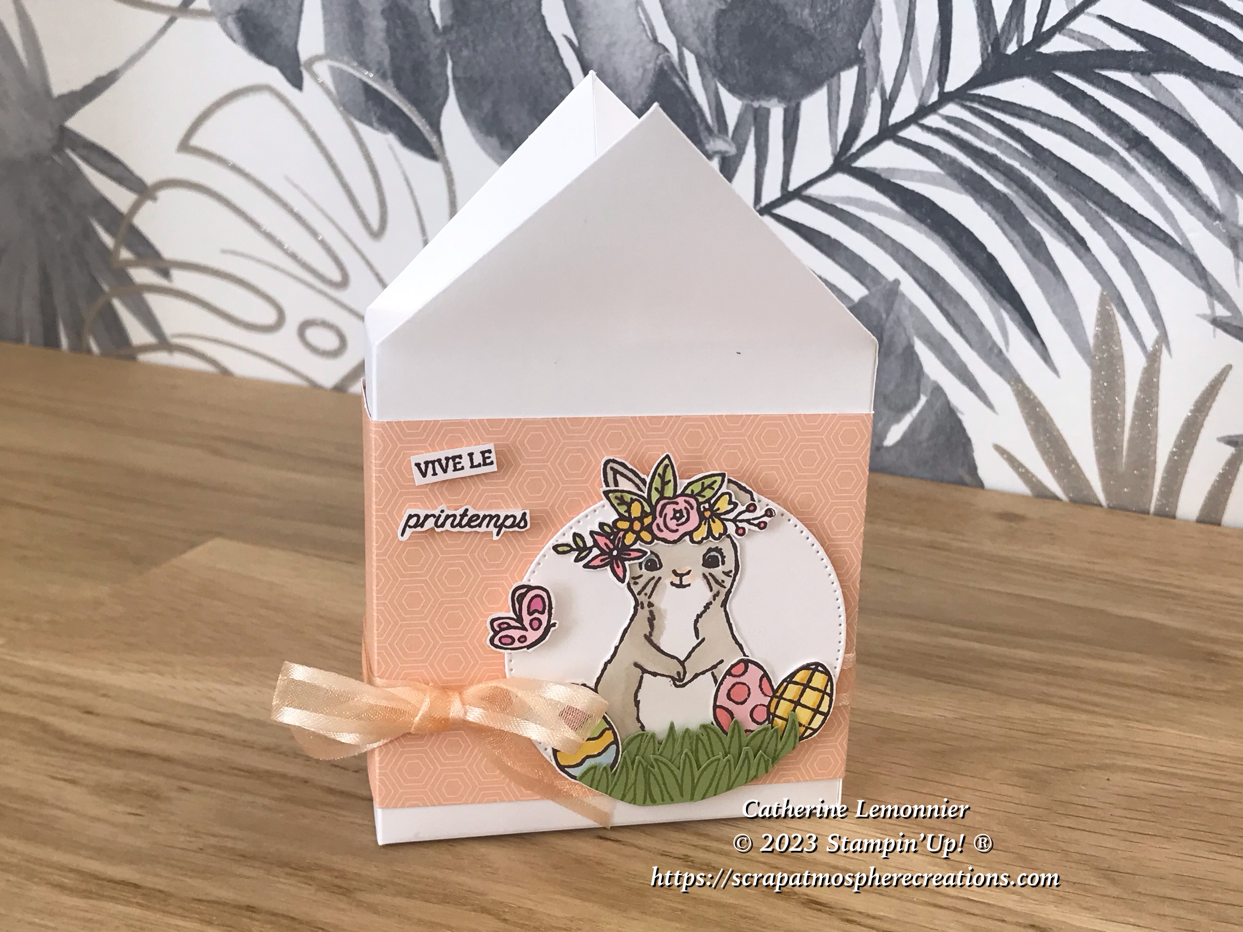 Les lapins sont adossés sur des cercles « couture » du set de poinçons Formes à la Mode, et je les ai collés avec des Stampin’dimensionals pour laisser assez de place pour le positionnement des rubans. Pour le « rose » il s’agit du Ruban à tissage léger Papaye Pâle, et pour l’autre c’est le Ruban à double surpiqûre Béguin Bleu et Blanc…c’est toujours un « plus » de pouvoir associer les papiers et les rubans de même couleur !
