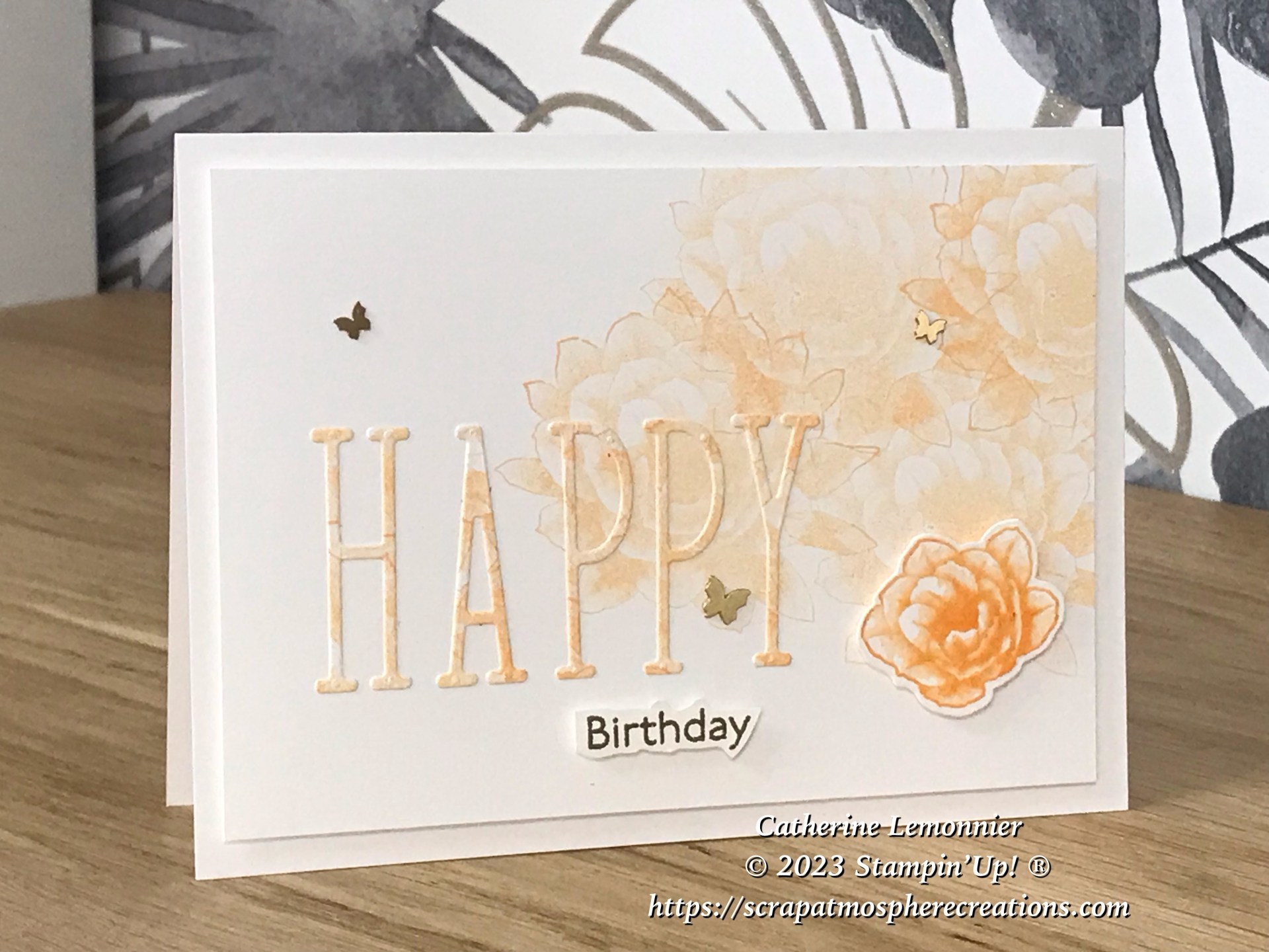 Alors pour la réalisation de cette carte, j’ai utilisé le lot Délicatesse du Désert du mini catalogue Janvier-Avril. J’ai simplement créé mon fond en tamponnant le même motif à plusieurs reprises avec de l’encre Papaye Pâle sur du papier Blanc Simple. Papaye Pâle fait partie de la collection In Color 2021-2023, elle va donc nous quitter prochainement…C’est une couleur orangée très douce que je regretterai…