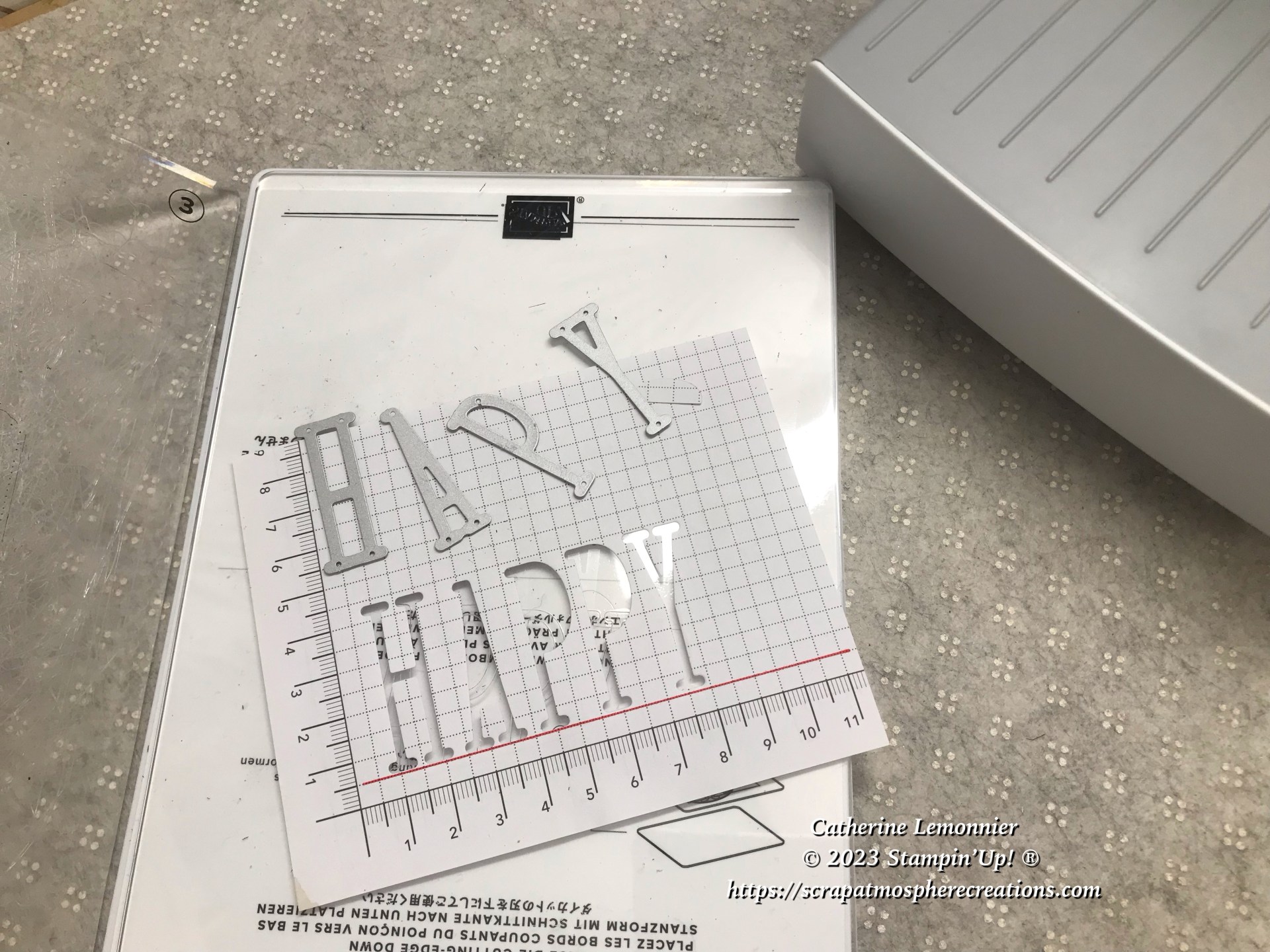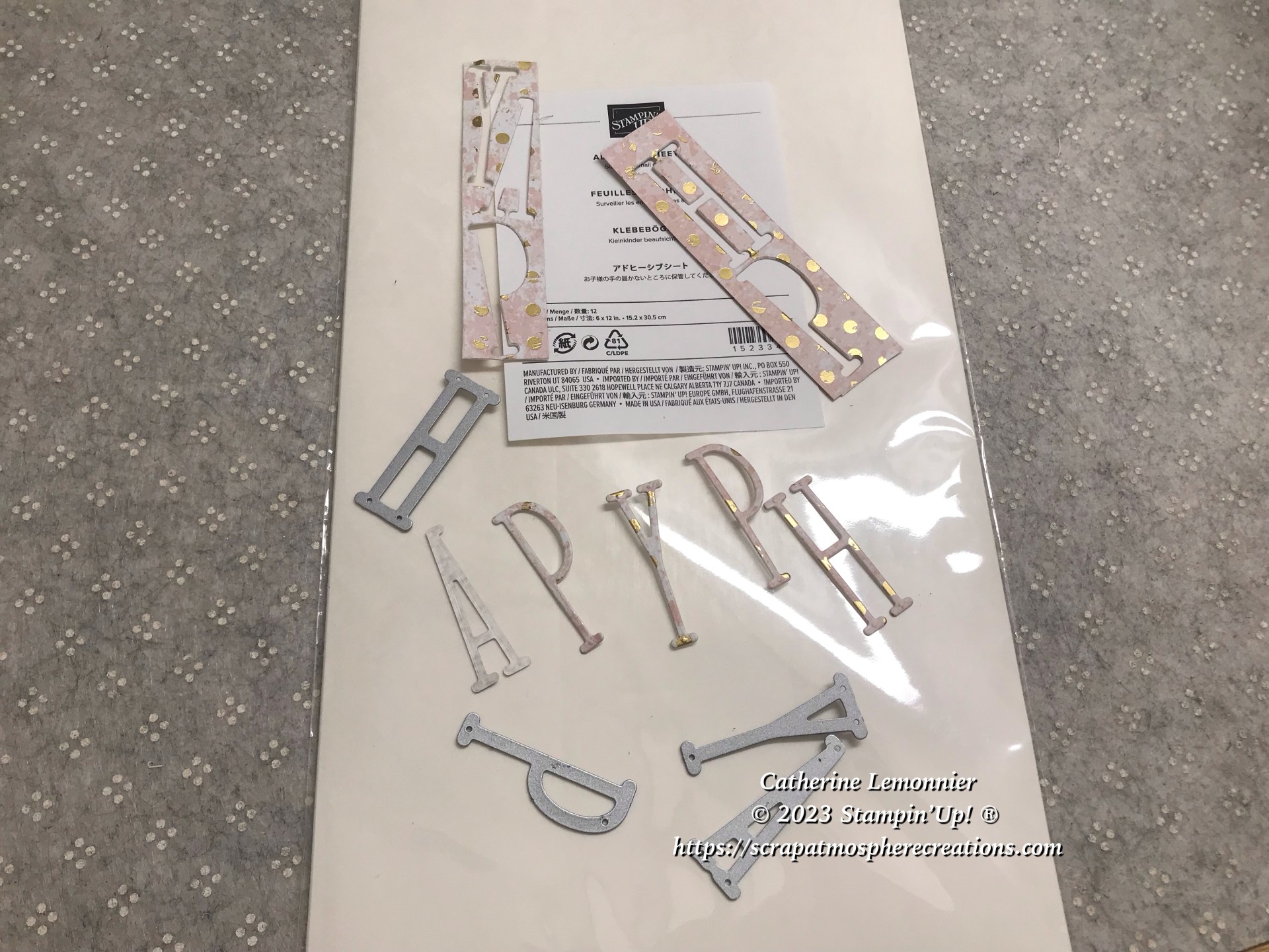 Je me suis donc appuyée sur le modèle d’une carte réalisée récemment, et j’ai réalisé le mini tuto en photos à l’occasion de la réalisation d’une autre carte…dans les deux cas c’est l’Alphabet à la Mode apparu dans le mini catalogue Janvier-Avril que j’ai utilisé, ainsi que les feuilles d’adhésif pour doubler les papiers et coller les lettres proprement. Par contre lors de l’atelier, j’ai remplacé les feuilles d’adhésif par les feuilles de mousse adhésive qui s’utilisent de la même façon et passent parfaitement dans la machine de découpe, et donnent nettement plus de hauteur aux lettres.