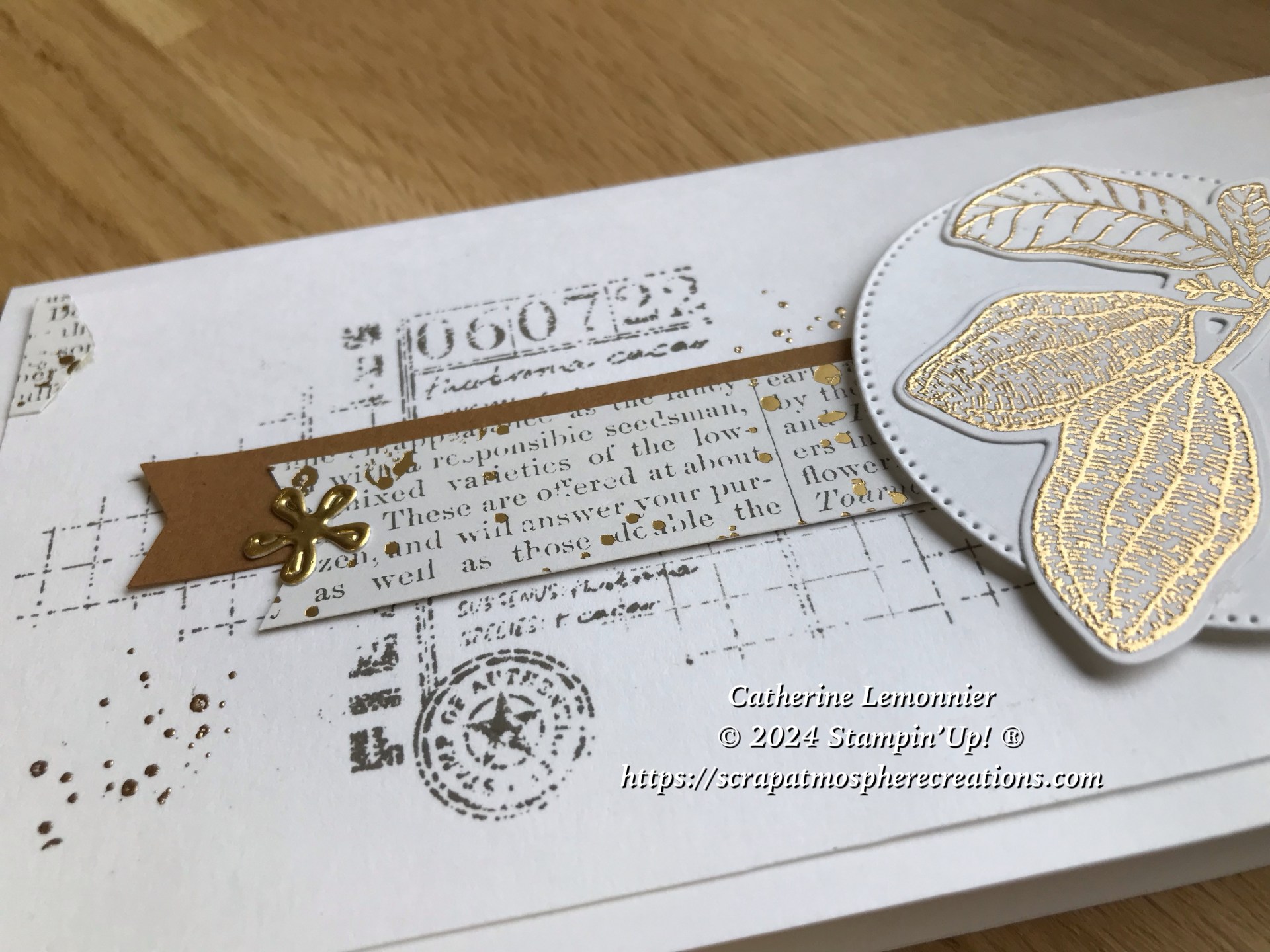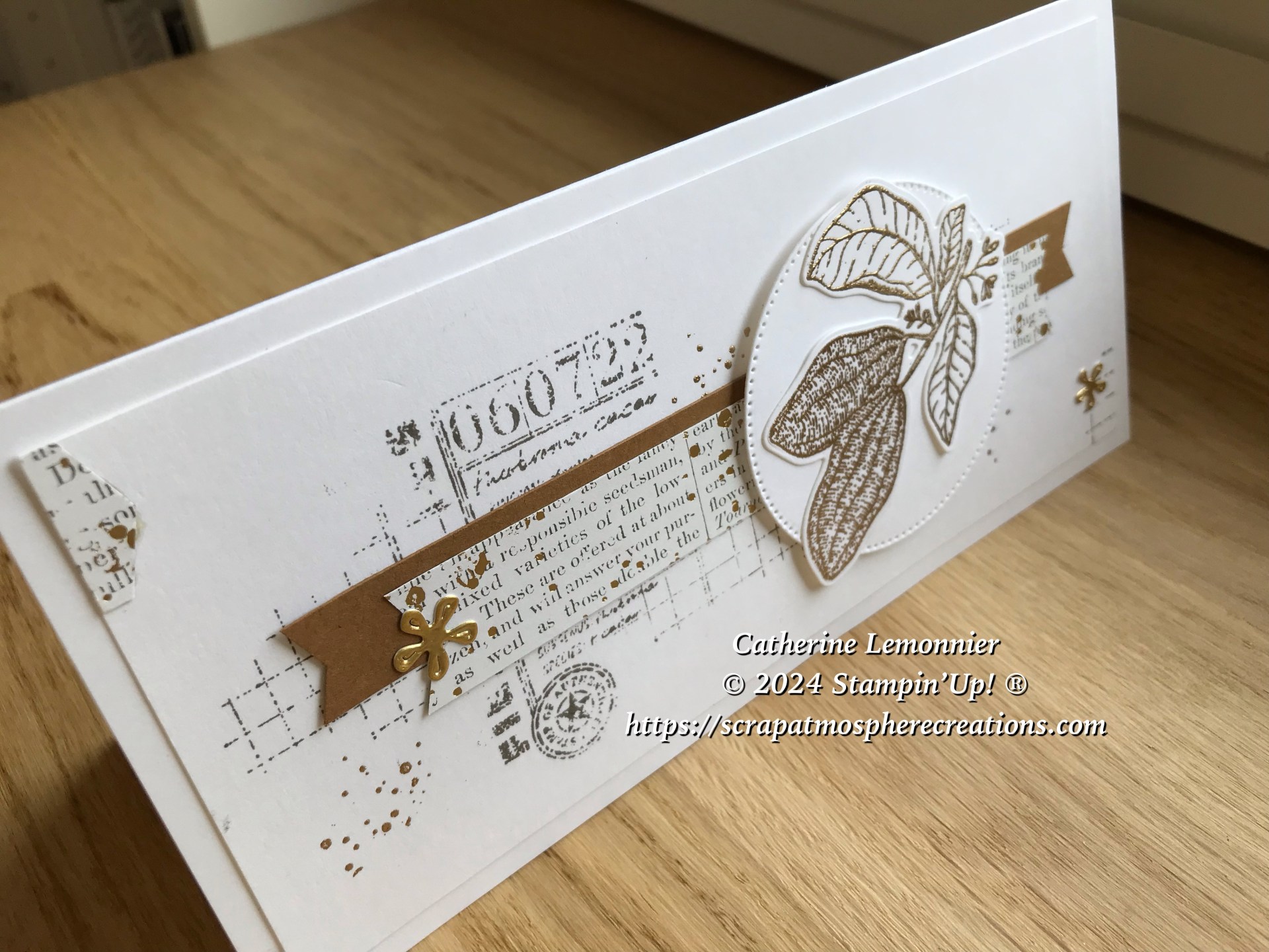 J’ai ajouté un cercle couture et une cabosse de cacao tamponnée et découpée avec le lot Tendre et Elégant, que j’ai collé avec des mousses 3D.