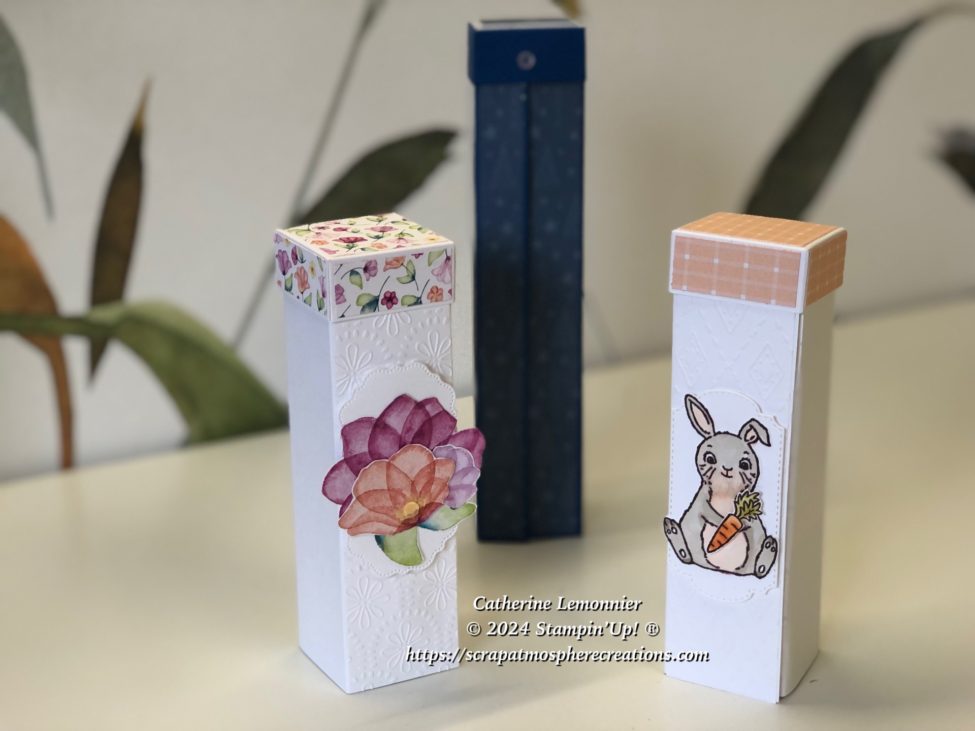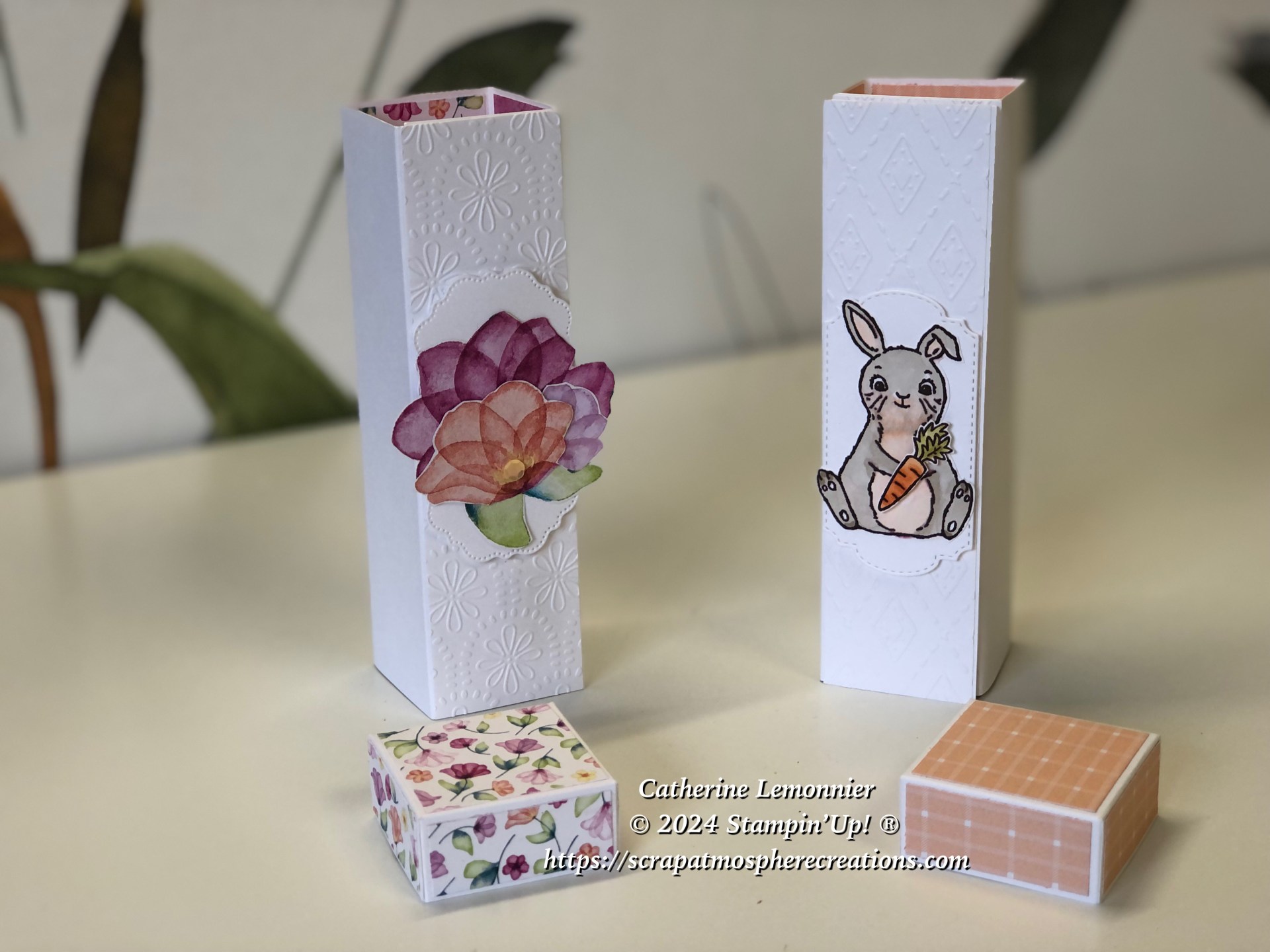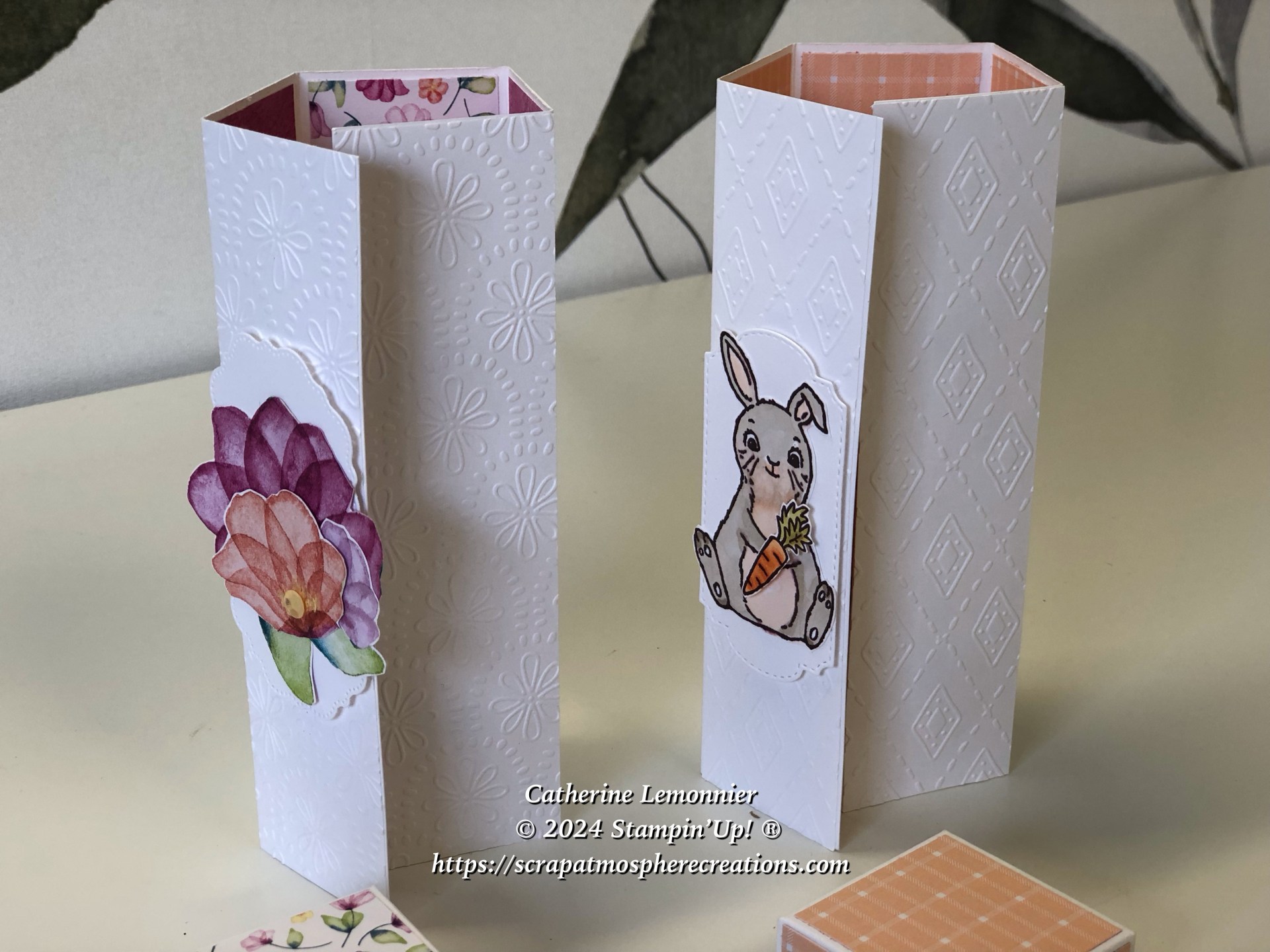 Du côté des fournitures, j’ai pioché un peu à droite, à gauche, bref dans toutes les sources de fournitures à notre disposition…vous aurez probablement reconnu les jolis motifs tamponnés du set de tampons Lapin de Pâques du catalogue annuel…au mini-catalogue Janvier-Avril j’ai emprunté les poinçons Timbres intemporels, et les poinçons Expressions Attentionnées…le papier d’habillage de la boîte de Pâques vient de la brochure Sale a Bration, du lot de papiers Jours Ensoleillés offert en cadeau en début d’année… enfin, c’est sur la Boutique en Ligne, dans la rubrique Exclusivités en Ligne, que je me suis procuré les superbes papiers Fleurs Exquises qui habillent la seconde boîte, ainsi que les plioirs à gaufrage Motifs Amusants que j’ai utilisés pour habiller le panneau avant des deux modèles…