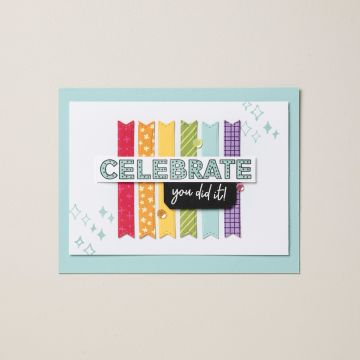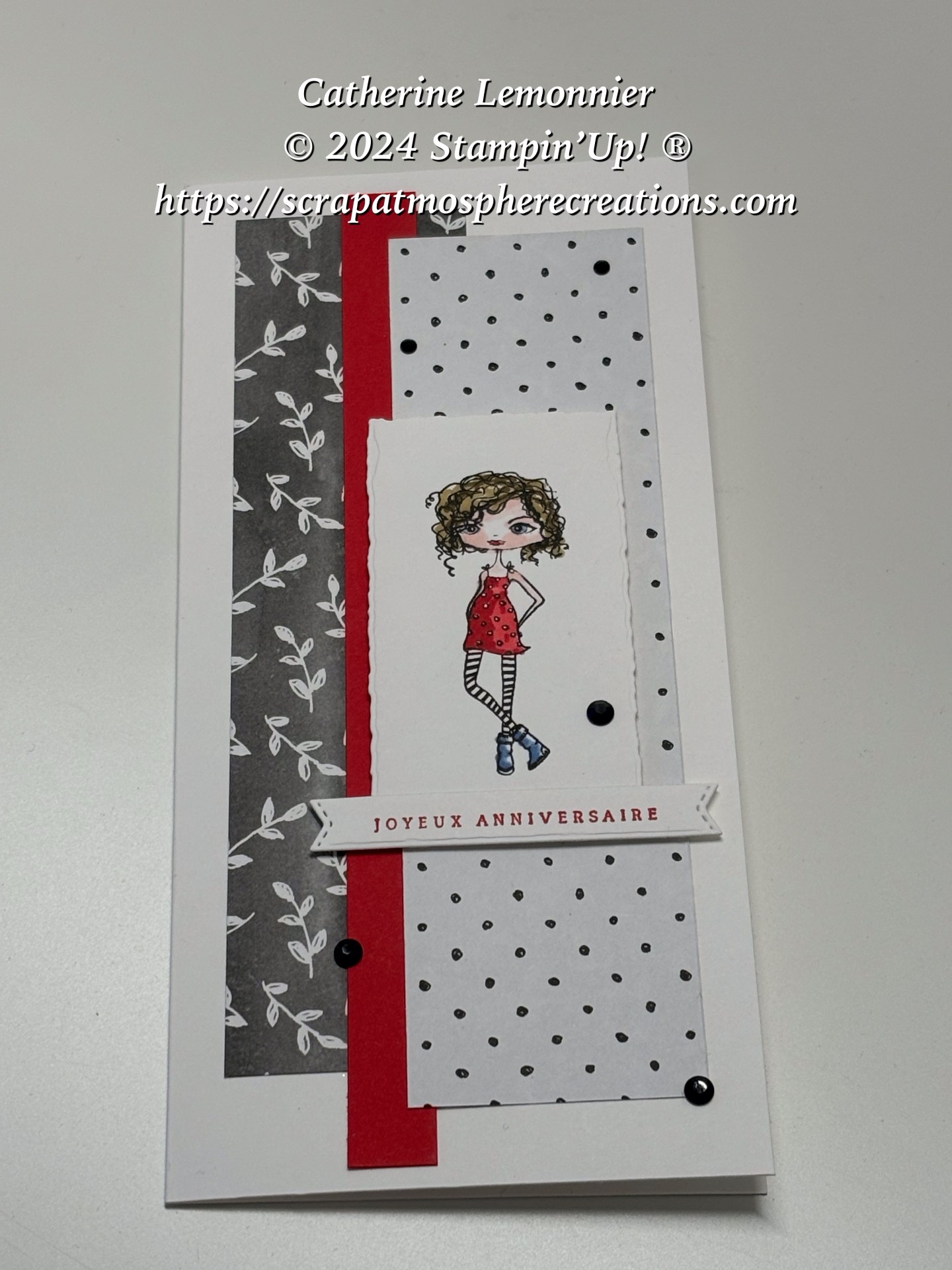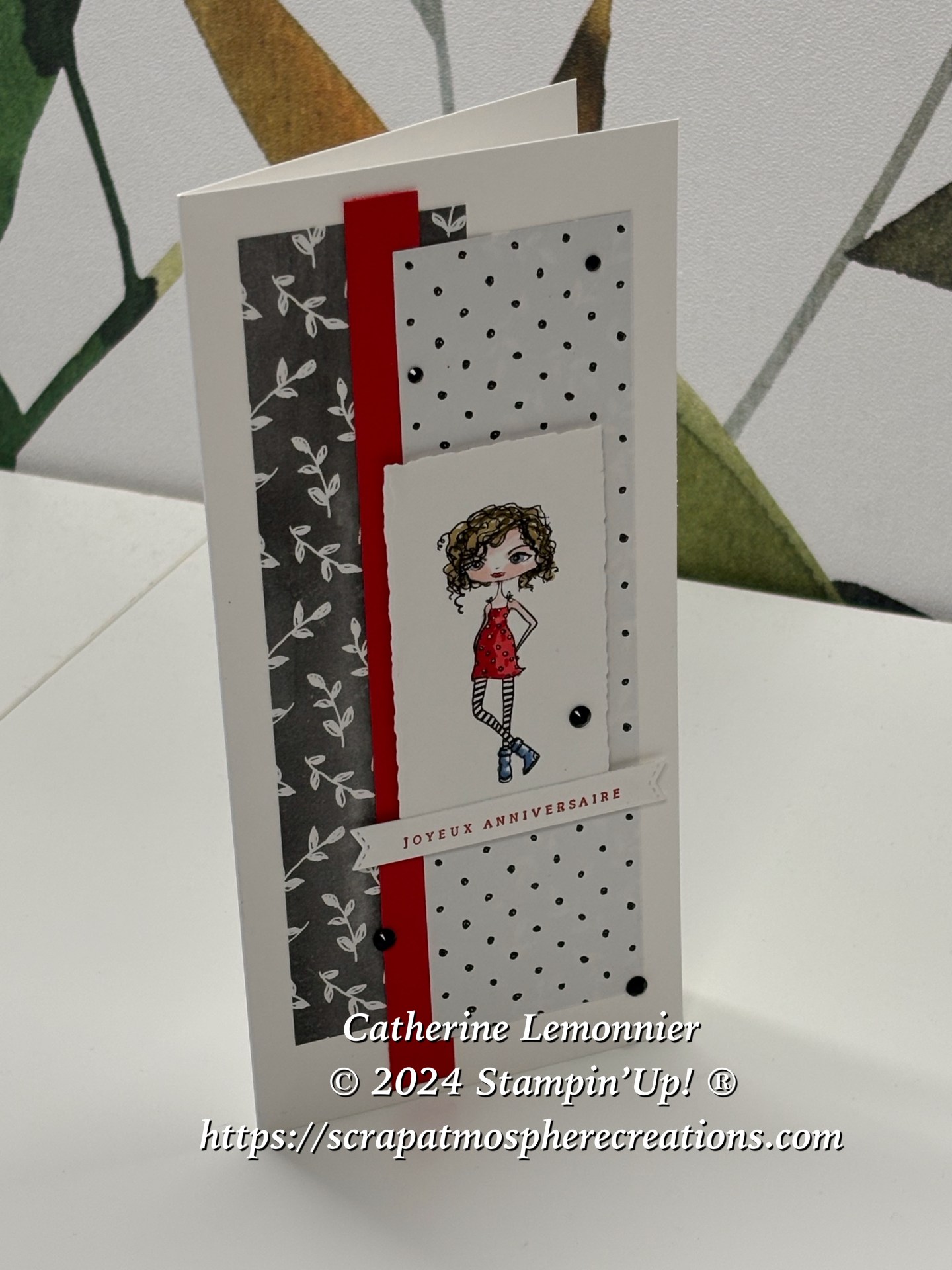 J’ai choisi un format de carte « Slim » que j’affectionne particulièrement (20 cm de haut x 9,5 de large) et j’ai ensuite placé les différents éléments de la carte jusqu’à ce que l’ensemble me plaise. Quelques bijoux noirs pour la petite touche de brillant, et voilà !