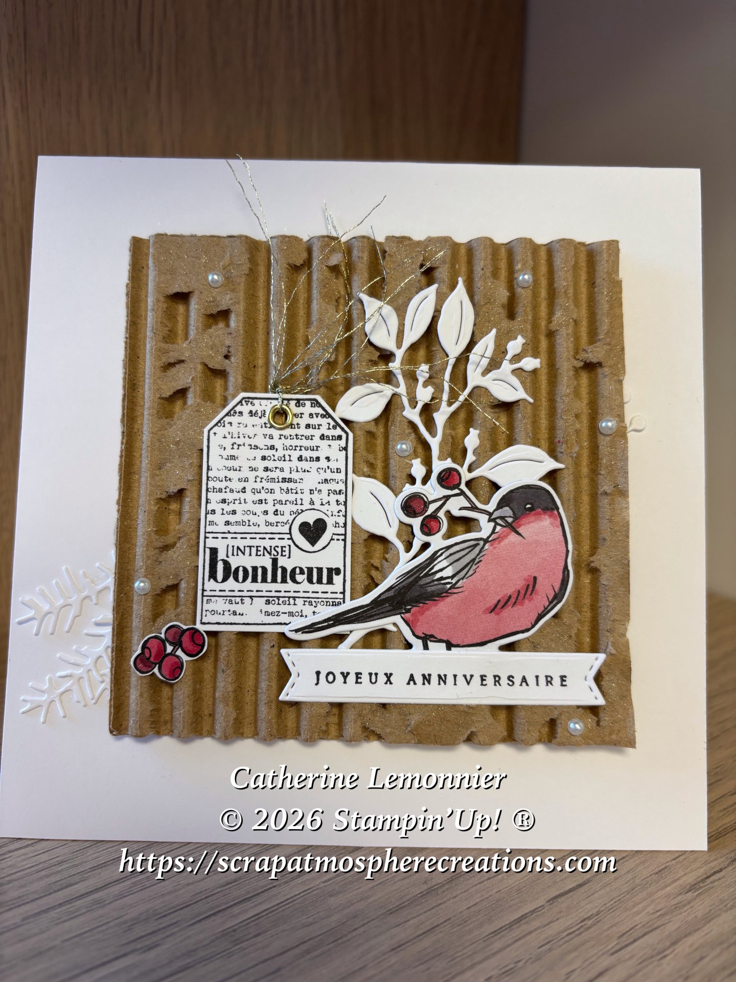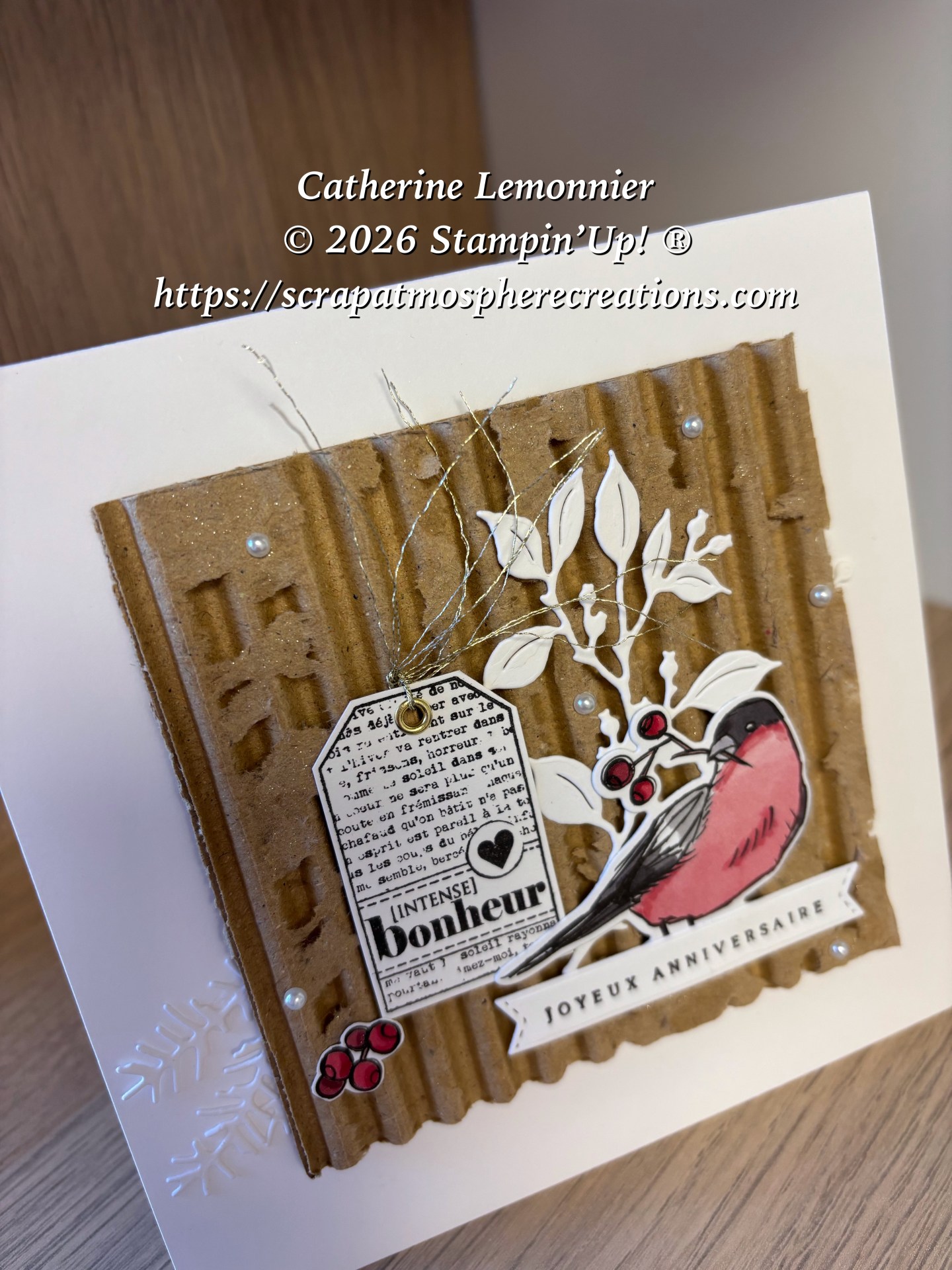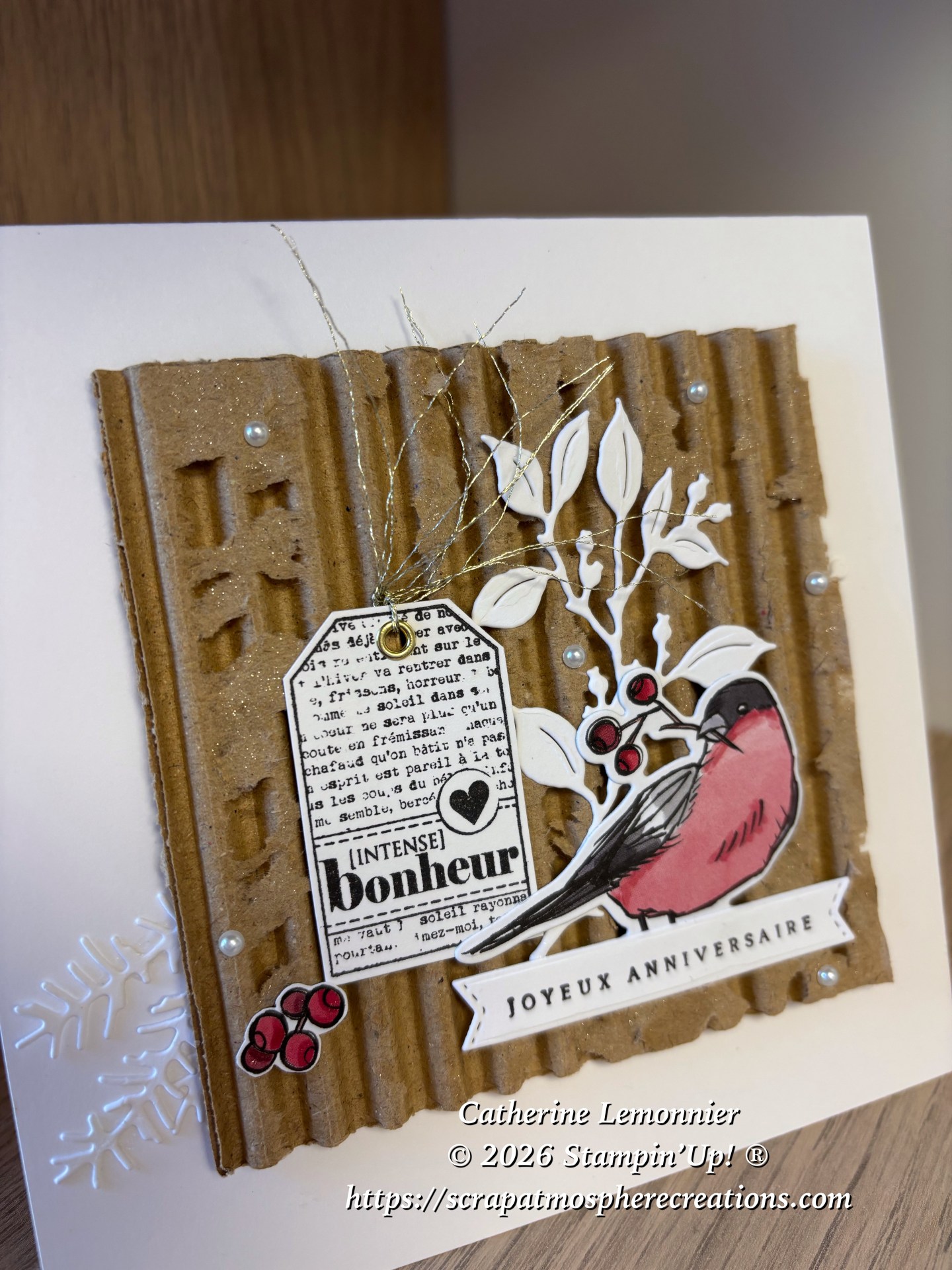 En ce début d’année il y a aussi des anniversaires à fêter, voici une carte destinée à une amie très chère ! C’est la première carte que j’ai créée cette année, et c’est elle qui a remis dans mon actualité ce morceau de carton « épluché » qui n’a l’air de rien mais qui ajoute beaucoup à mon avis.