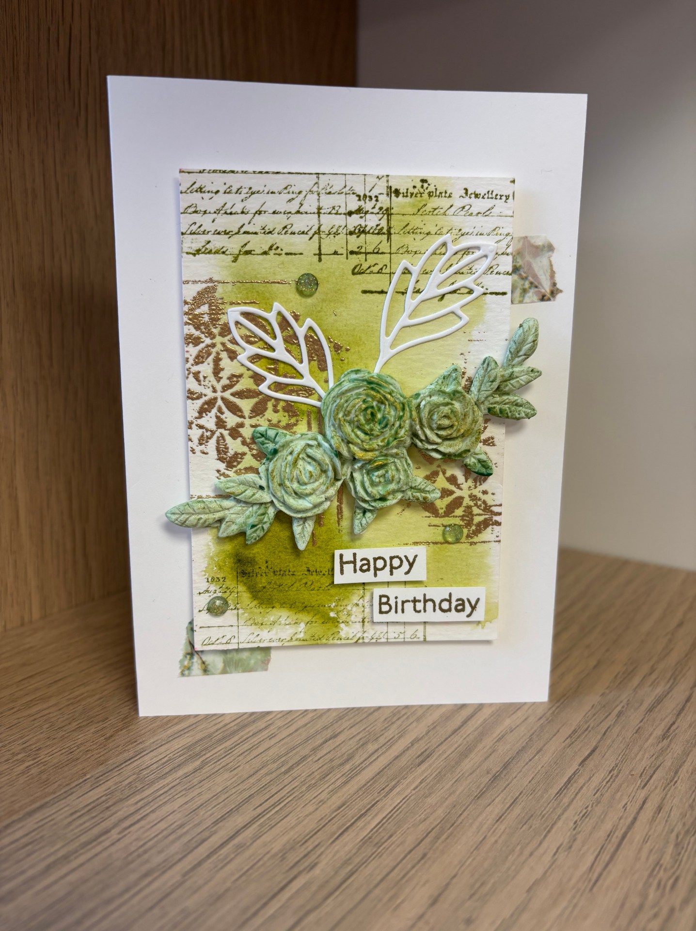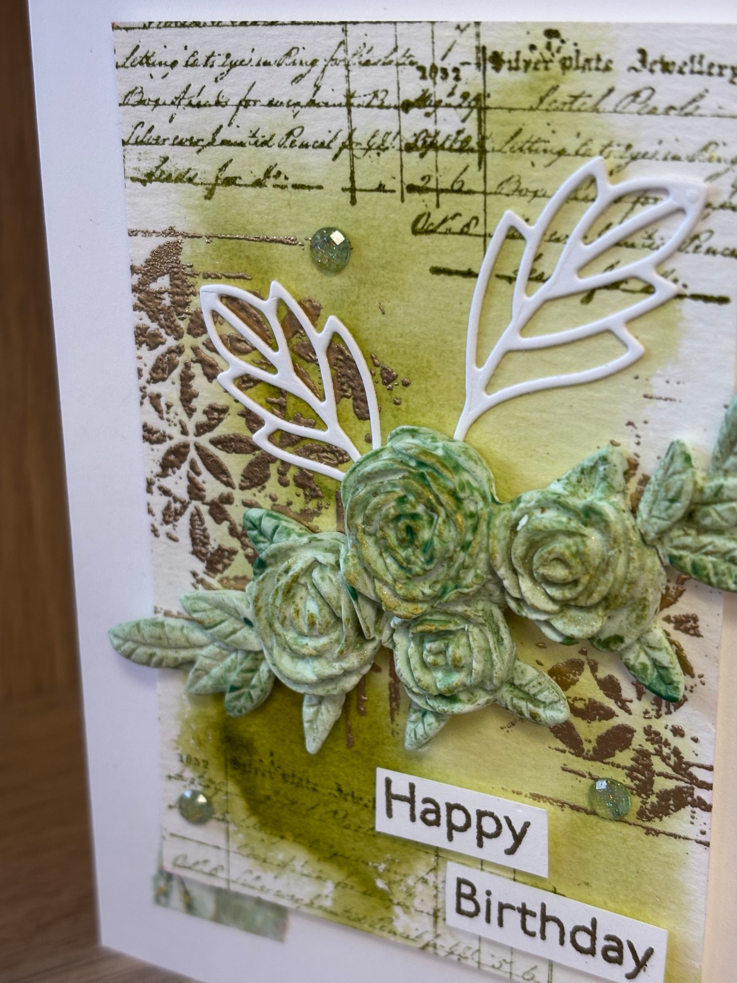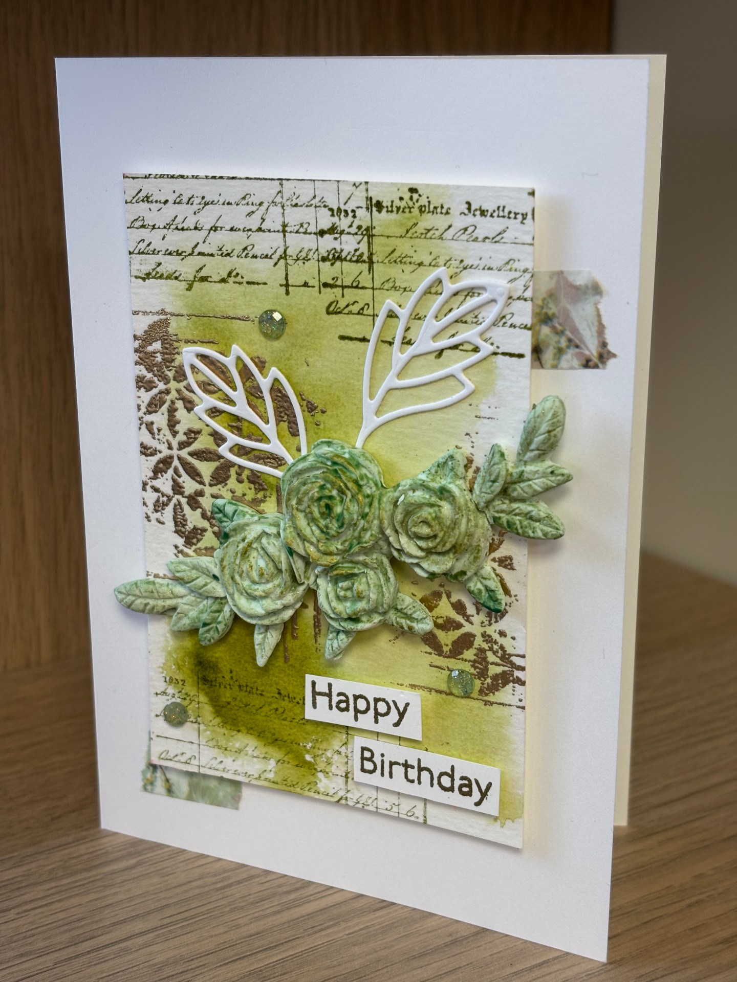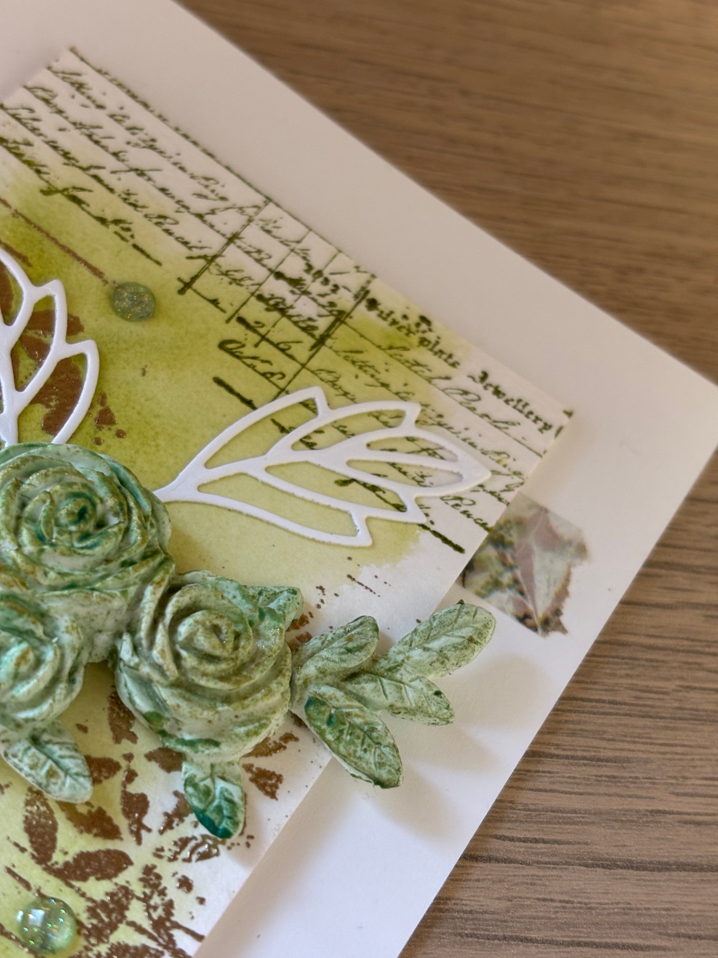 Deux découpes de poinçons blanches, deux tamponnages embossés avec de la poudre or, deux petits morceaux de washi et trois gemmes suffisent à compléter le tout !