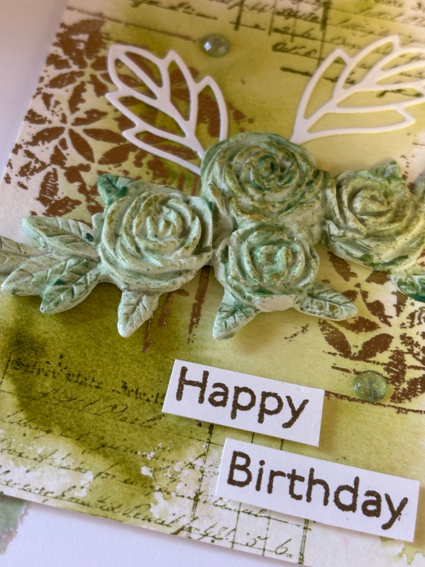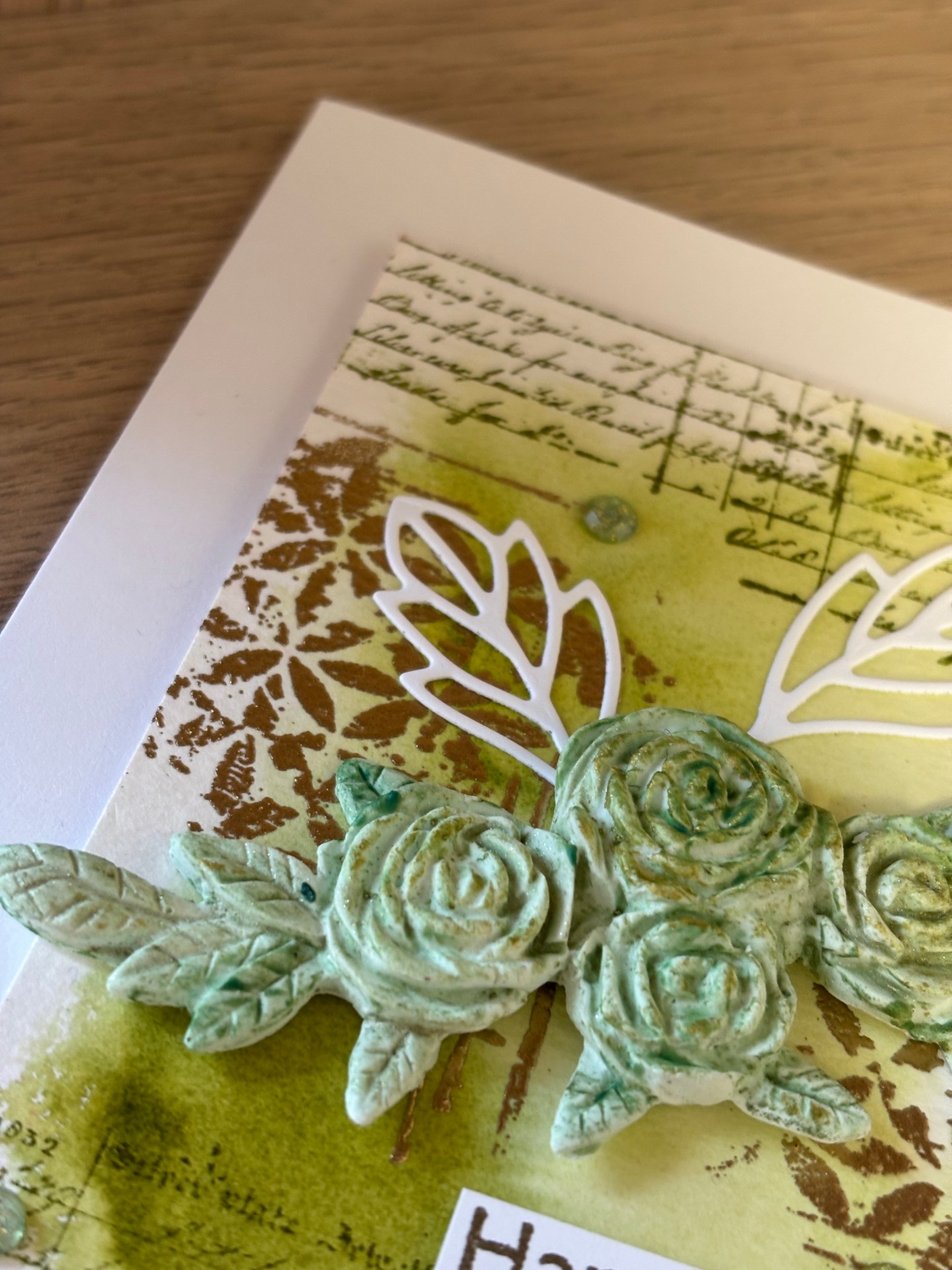 Pour cette carte, j’ai créé un fond « patouille » sur du papier aquarelle, et un moulage dans de la Patarev que j’ai peint après séchage (je vous ai parlé de ces moulages il n’y a pas longtemps DANS CE POST )