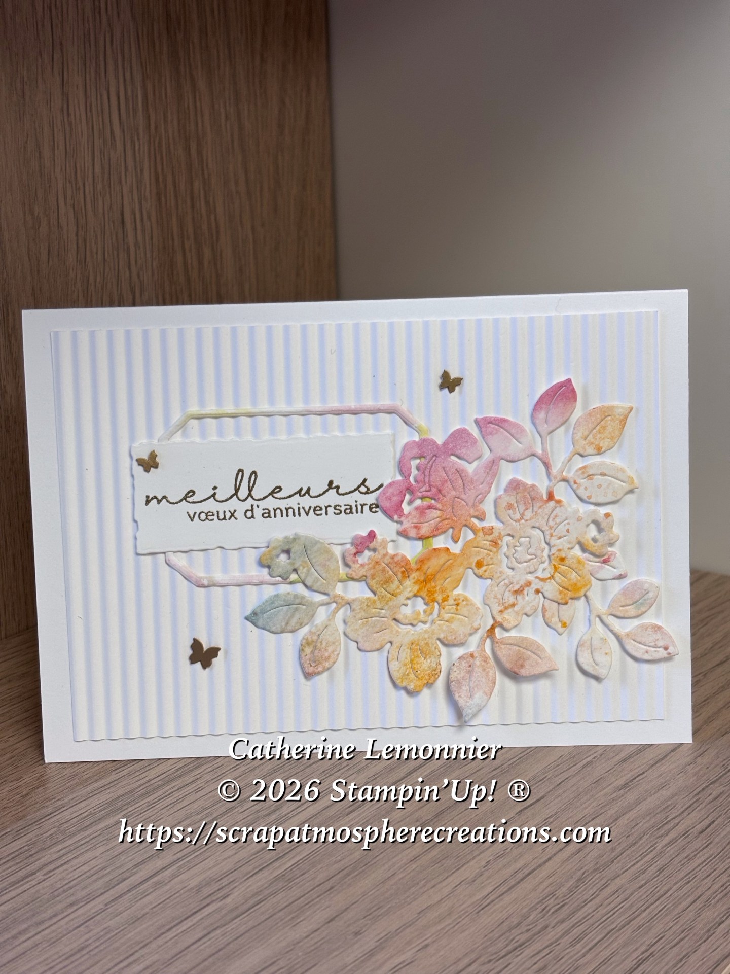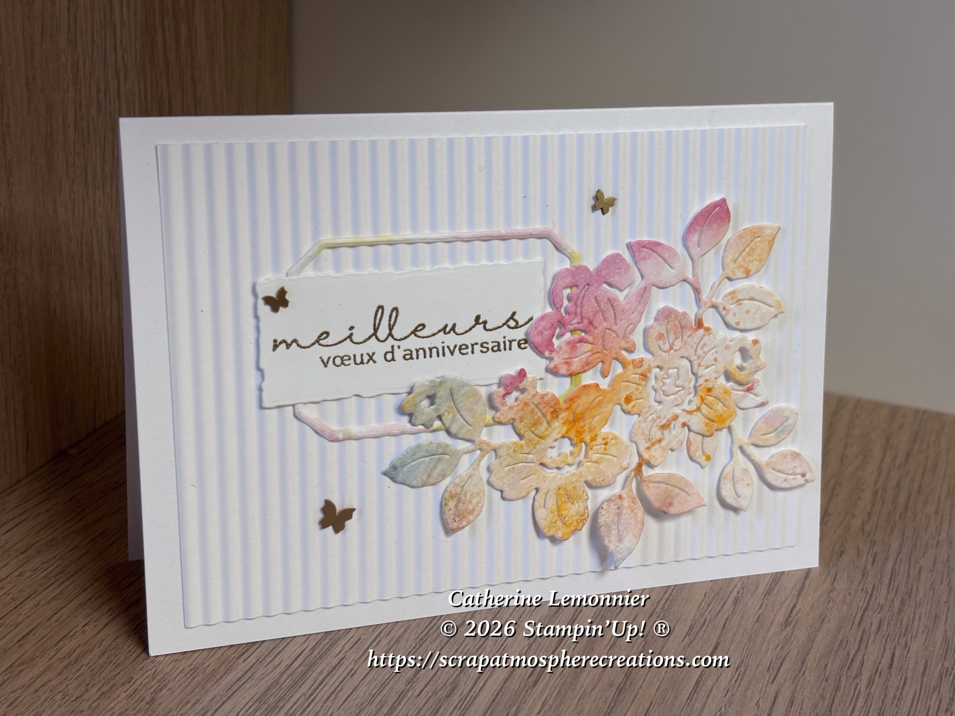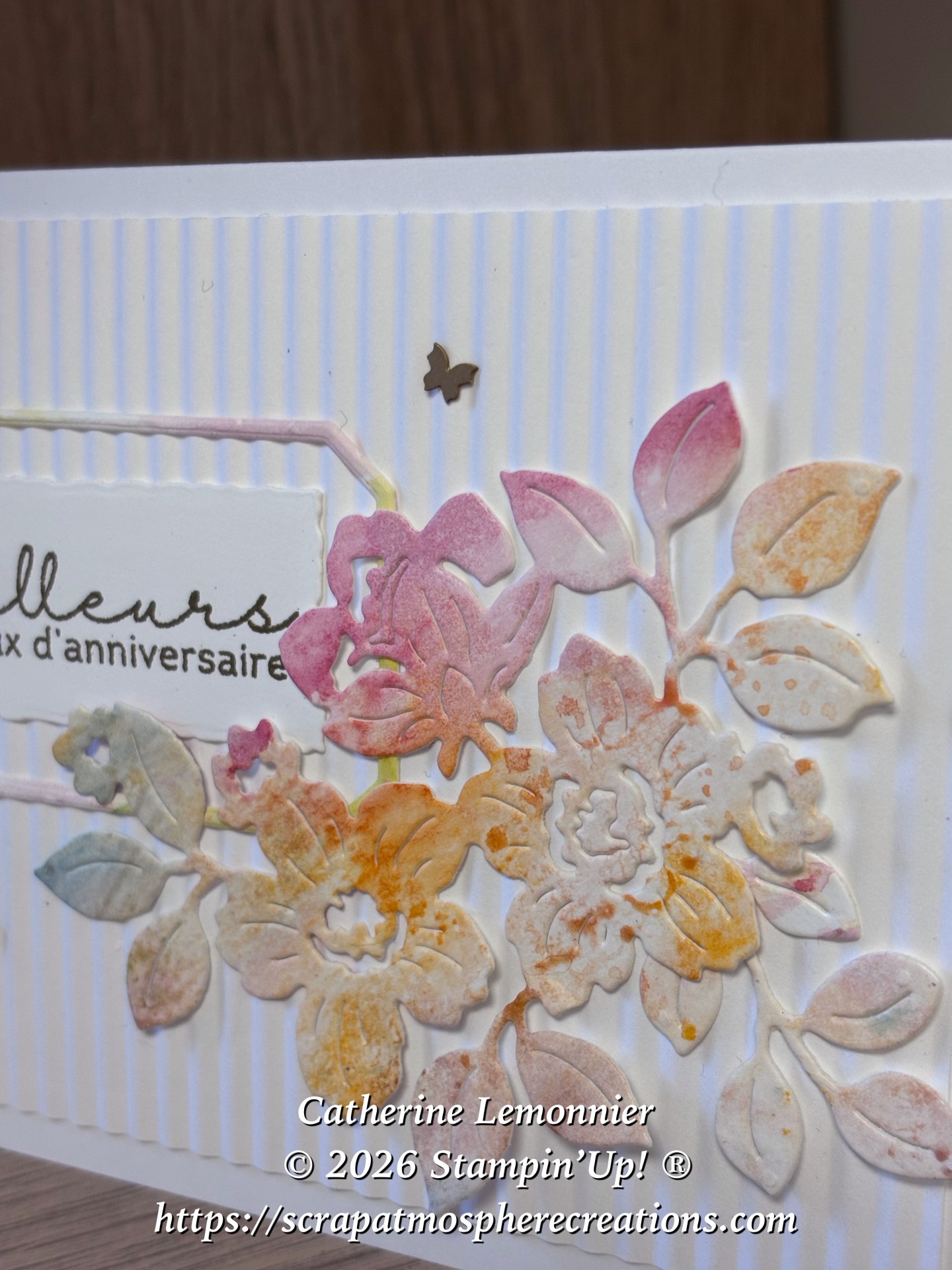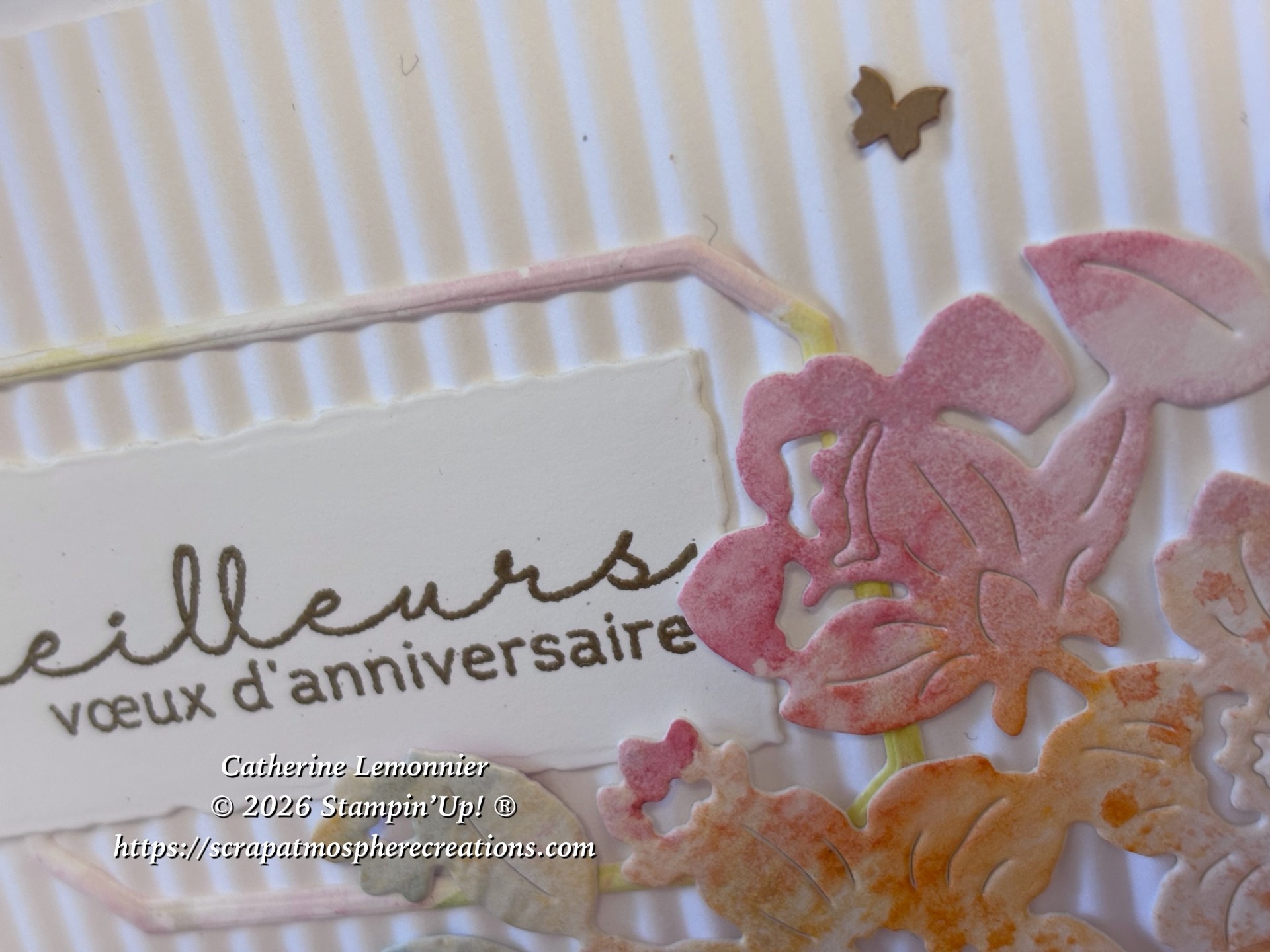 Promesse désormais tenue, puisque c’est un de ces fonds que j’ai décidé d’utiliser pour la carte destinée à leur maman. J’ ai simplement découpé ces jolies fleurs du lot Bouquet amical que vous avez pu voir récemment sur la Boutique en Ligne et je l’ai mis en valeur très simplement avec le plioir 3D Mini Ondulé, un souhait et trois jolis papillons dorés…