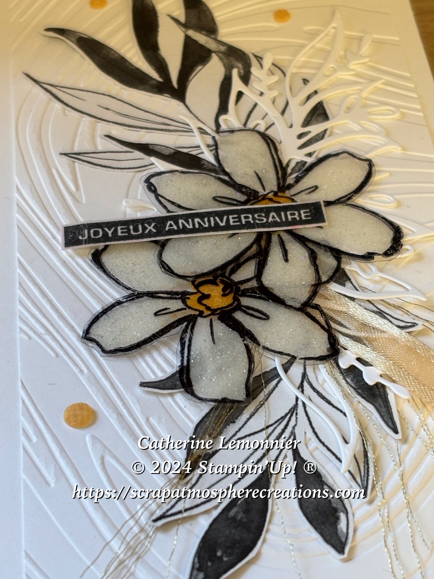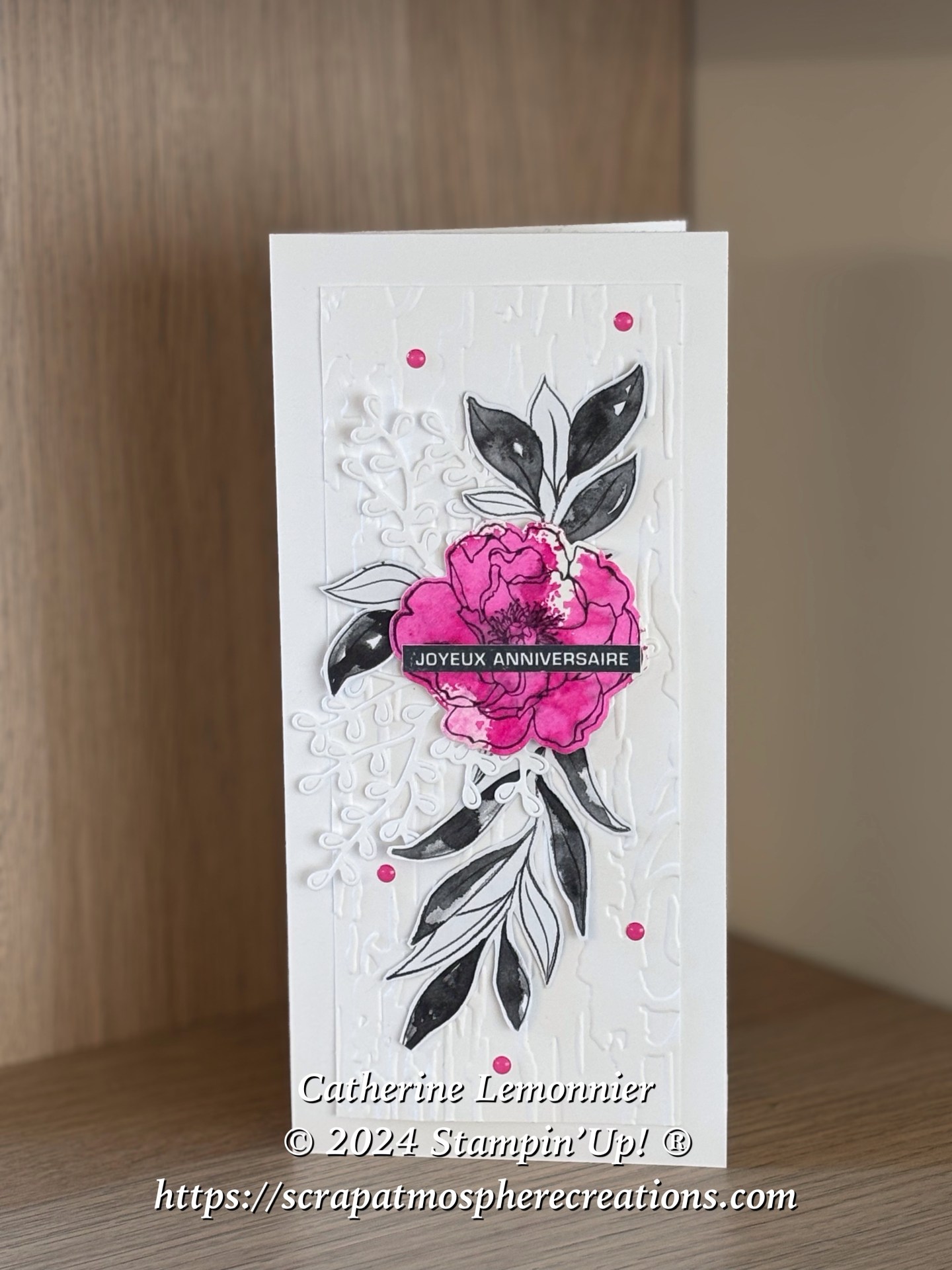 J’ai choisi un format de carte « Slim » que j’affectionne particulièrement (20 cm de haut x 9,5 de large) et j’ai ensuite placé les différents éléments de la carte jusqu’à ce que l’ensemble me plaise. Quelques bijoux noirs pour la petite touche de brillant, et voilà !