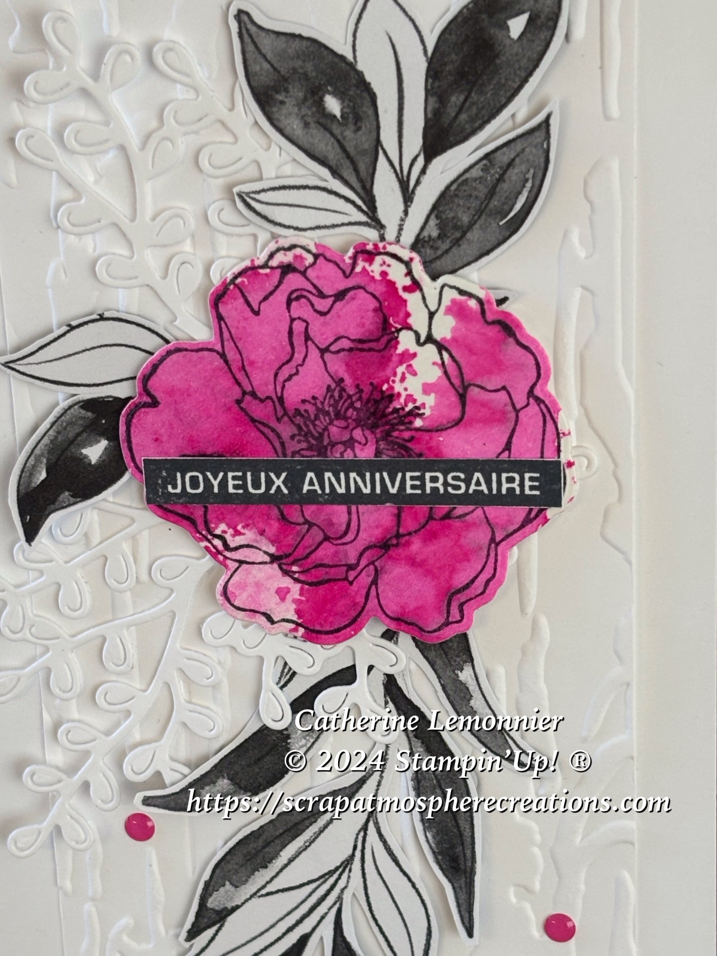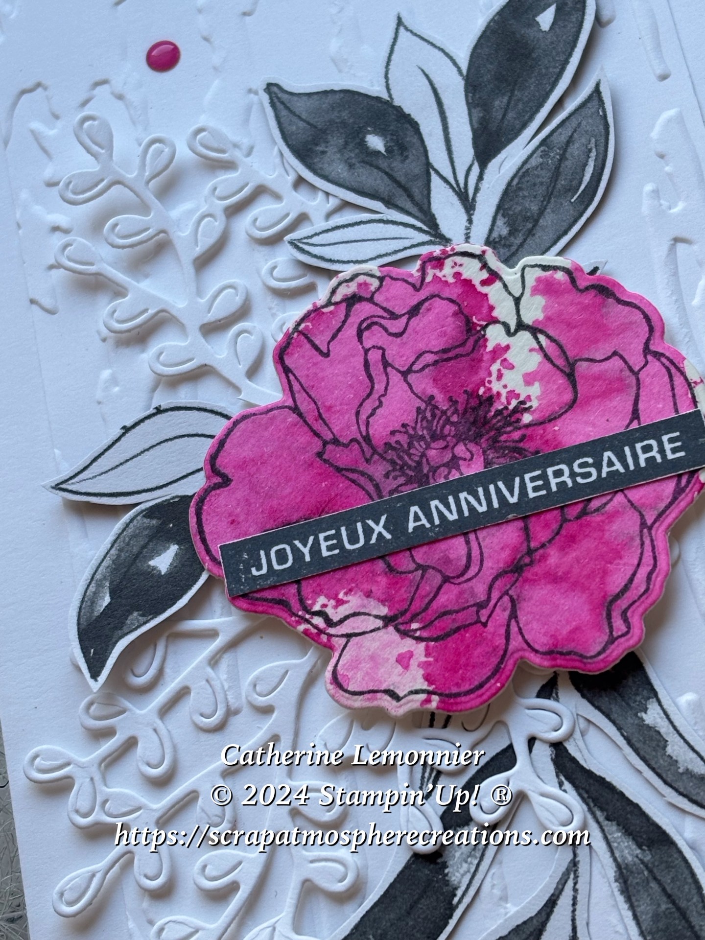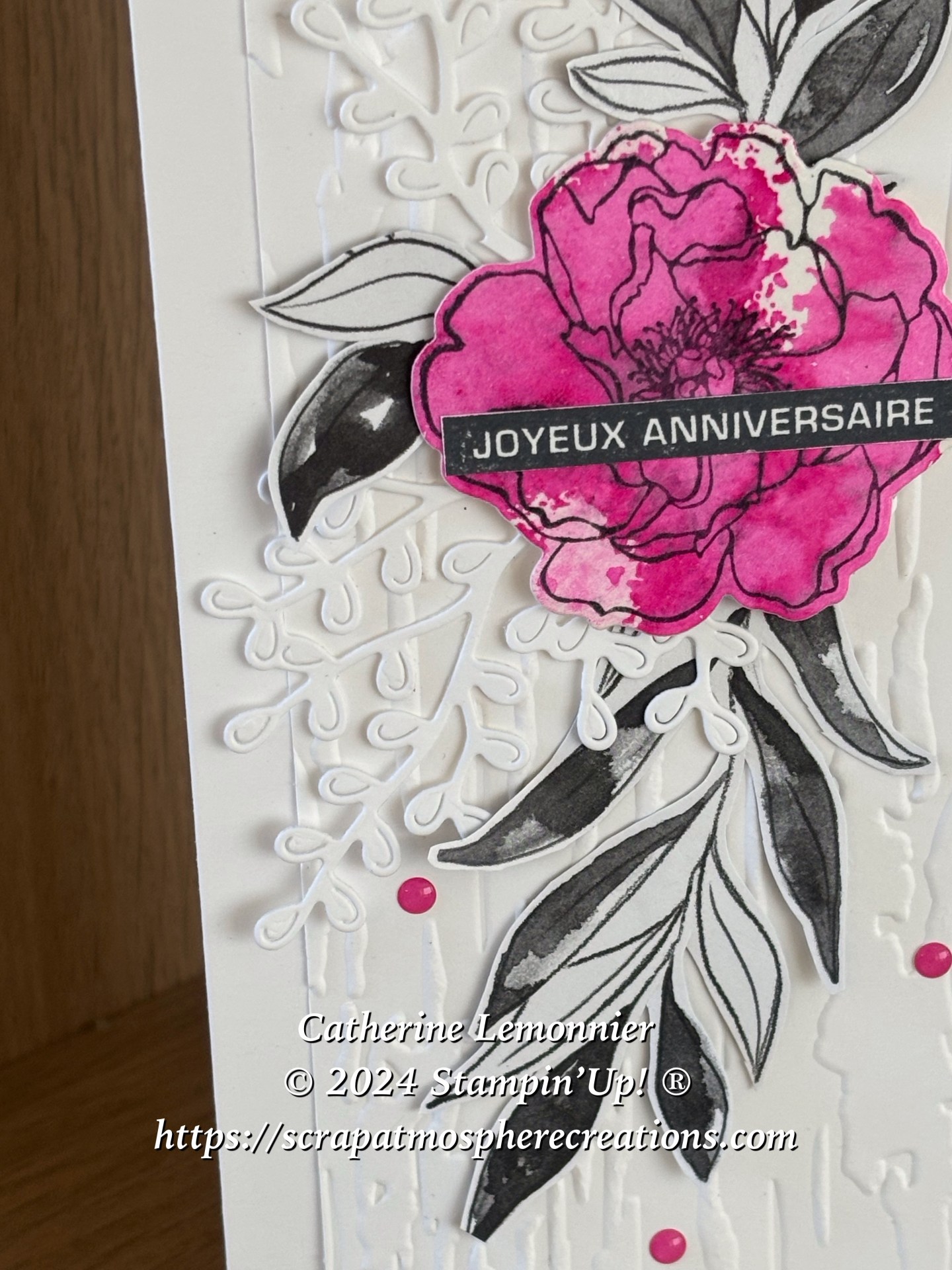 Les petites bulles étant très présentes, il suffit de peu de choses pour créer une jolie carte. J’ai donc ajouté une jolie étiquette du lot Amours sans limites, et j’ai fait quelques fleurs à l’aide du plioir Multitude de Fleurs, cette fois j’ai choisi une de nos nouvelles couleurs In Color, Joli Rose.