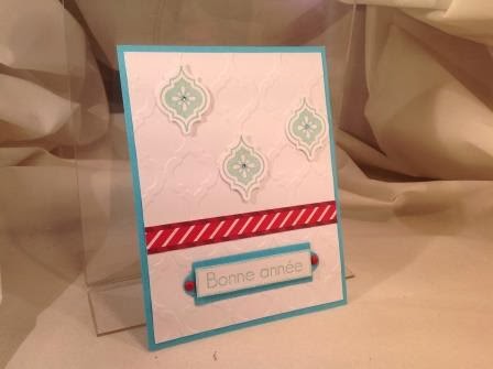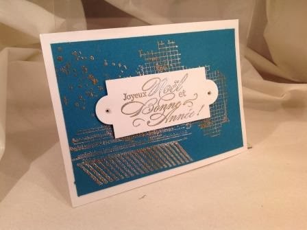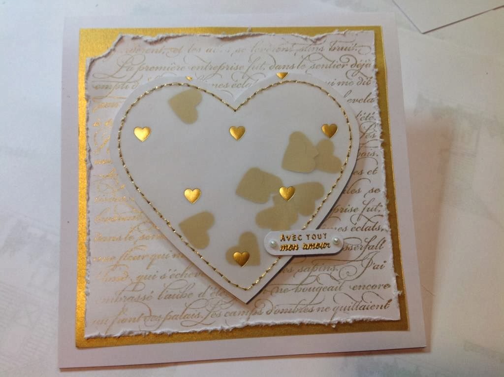 Le cœur ainsi réalisé est collé avec des 3-dimensionals sur le fond blanc encré avec le tampon En Français et l’encreur Or. J’ai « usé » les 4 côtés de ce fond avec l’outil Stampin pour effet Vintage avant de le coller sur un mat doré, puis j’ai recollé le tout sur mon fond de carte blanc…